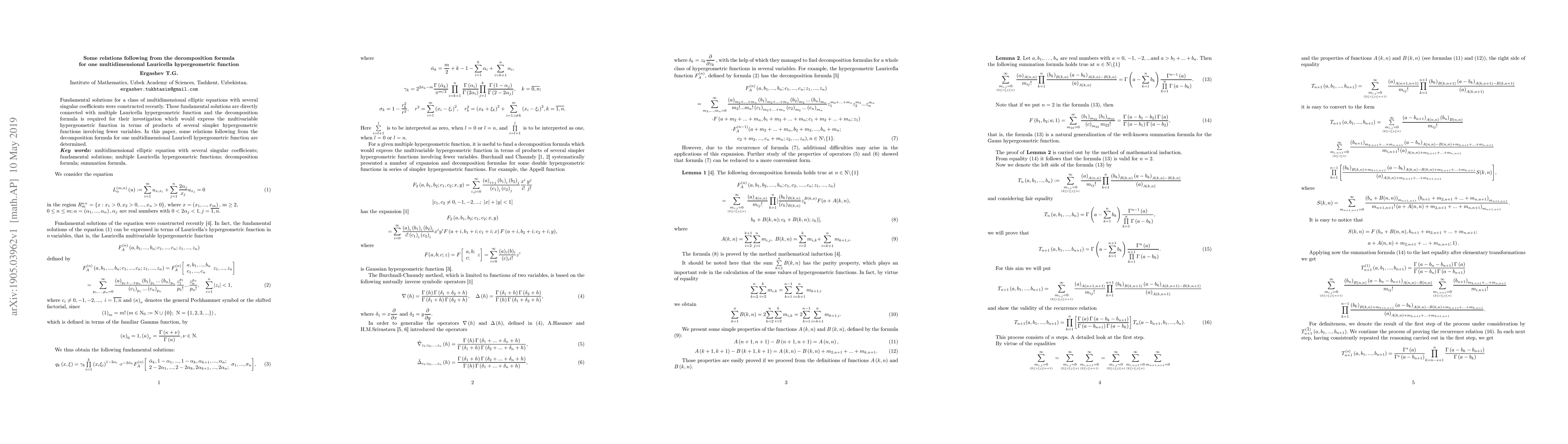 This paper investigates relations derived from a decomposition formula for a specific multidimensional Lauricella hypergeometric function, which is crucial for understanding fundamental solutions of elliptic equations with singular coefficients. The decomposition simplifies the multivariable hypergeometric function into products of simpler, fewer-variable hypergeometric functions.