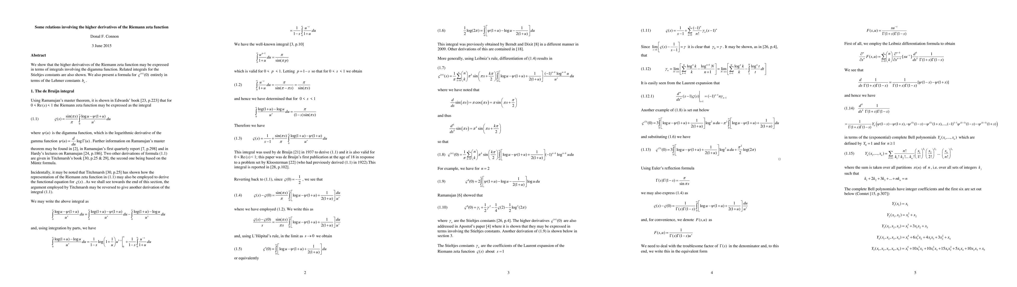 This paper demonstrates that higher derivatives of the Riemann zeta function can be represented using integrals involving the digamma function, and it also presents related integrals for the Stieltjes constants. Additionally, it provides a formula for the derivatives of the Riemann zeta function in terms of the Lehmer constants.