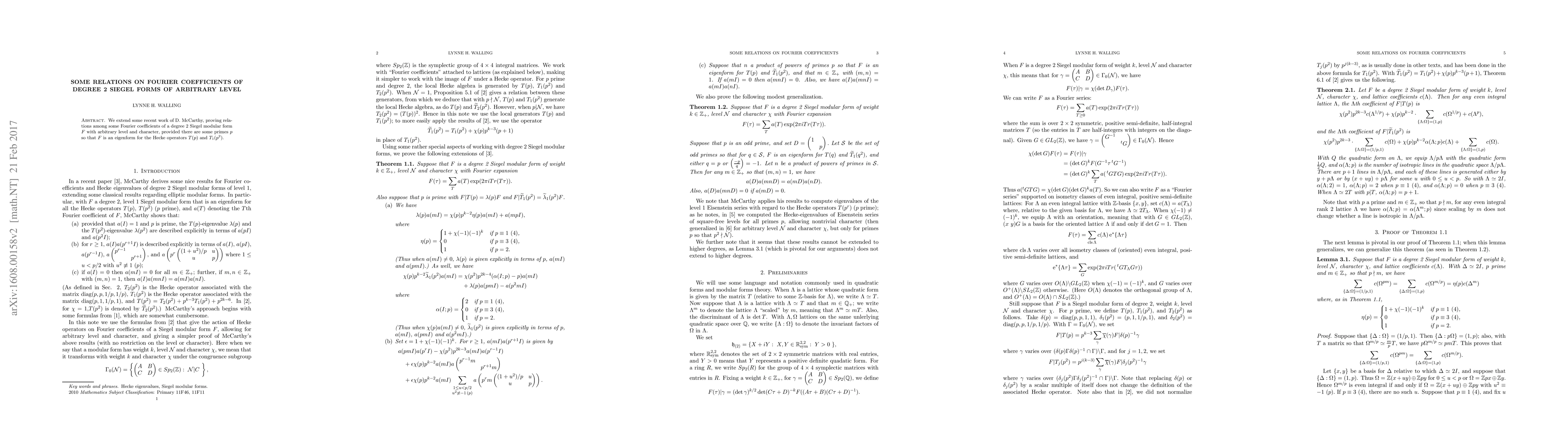 Summary: The paper extends McCarthy's work to establish relationships between Fourier coefficients of degree 2 Siegel modular forms of arbitrary level and character, given specific conditions on primes and eigenforms for certain Hecke operators.
