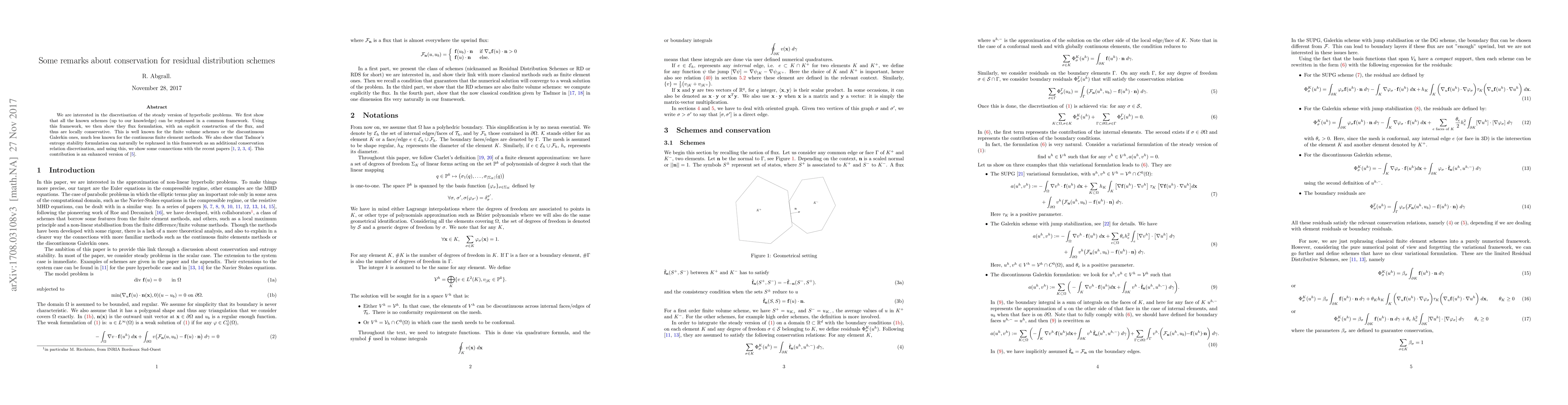 We are interested in the discretisation of the steady version of hyperbolic problems. We first show that all the known schemes (up to our knowledge) can be rephrased in a common framework. Using this framework, we first show all the known schemes have a flux formulation, with an explicit construction of the flux, and thus are locally conservative. This is well known for the finite volume schemes or the discontinuous Galerkin ones, much less known for the continuous finite element methods. We also show that Tadmor's entropy stability formulation can naturally be rephrased in this framework as an additional conservation relation discretisation, and using this, we show some conenction with the recent papers [1, 2, 3, 4]. This contribution is an enhanced version of [5].