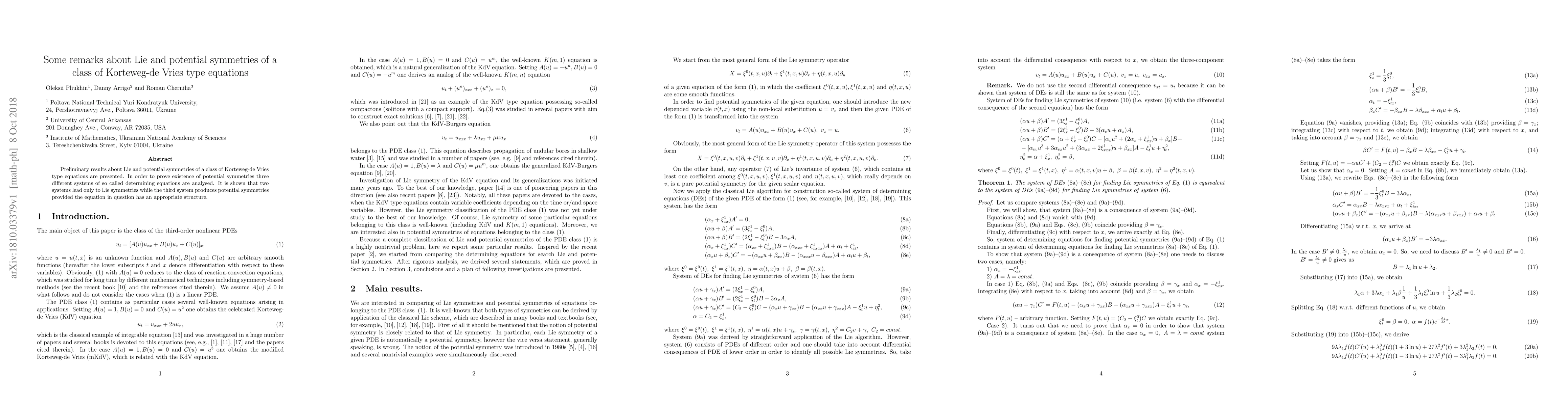 Preliminary results about Lie and potential symmetries of a class of Korteweg-de Vries type equations are presented. In order to prove existence of potential symmetries three different systems of so called determining equations are analysed. It is shown that two systems lead only to Lie symmetries while the third system produces potential symmetries provided the equation in question has an appropriate structure