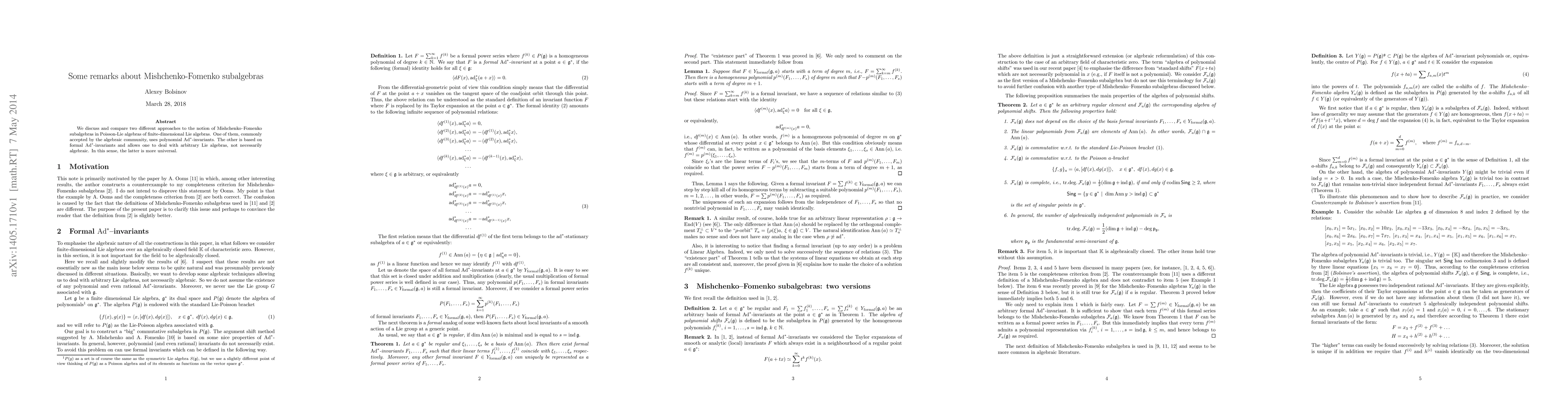 We discuss and compare two different approaches to the notion of Mishchenko--Fomenko subalgebras in Poisson-Lie algebras of finite-dimensional Lie algebras. One of them, commonly accepted by the algebraic community, uses polynomial $\Ad^*$-invariants. The other is based on formal $\Ad^*$-invariants and allows one to deal with arbitrary Lie algebras, not necessarily algebraic. In this sense, the latter is more universal.