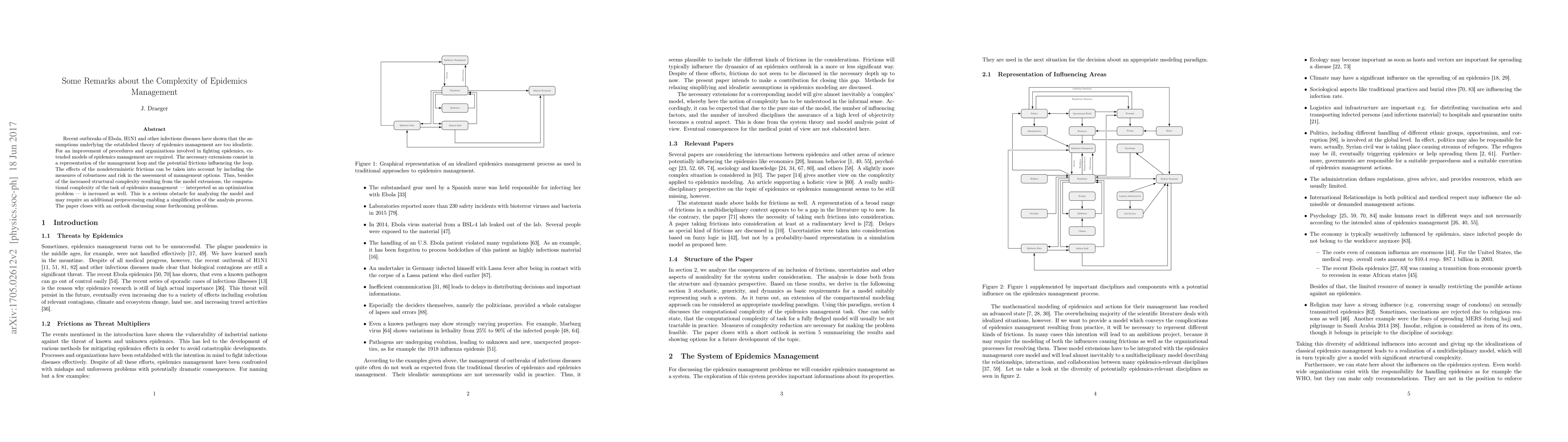 Recent outbreaks of Ebola, H1N1 and other infectious diseases have shown that the assumptions underlying the established theory of epidemics management are too idealistic. For an improvement of procedures and organizations involved in fighting epidemics, extended models of epidemics management are required. The necessary extensions consist in a representation of the management loop and the potential frictions influencing the loop. The effects of the non-deterministic frictions can be taken into account by including the measures of robustness and risk in the assessment of management options. Thus, besides of the increased structural complexity resulting from the model extensions, the computational complexity of the task of epidemics management - interpreted as an optimization problem - is increased as well. This is a serious obstacle for analyzing the model and may require an additional pre-processing enabling a simplification of the analysis process. The paper closes with an outlook discussing some forthcoming problems.