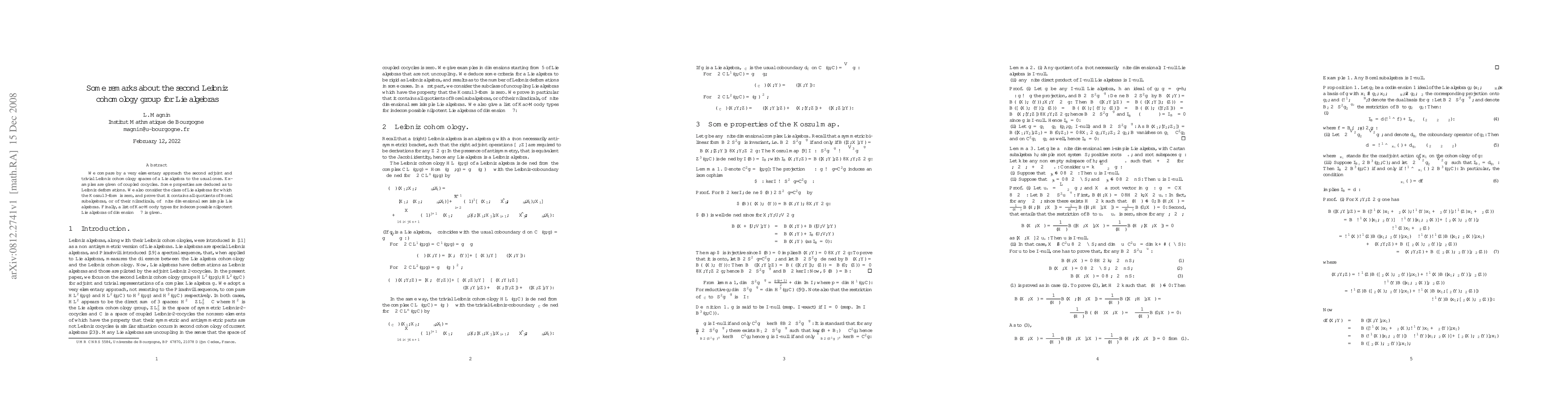 This paper compares second adjoint and trivial Leibniz cohomology groups of Lie algebras using a basic approach and presents examples of coupled cocycles. It also explores properties of Leibniz deformations and characterizes Lie algebras with zero Koszul 3-forms, including all quotients of Borel subalgebras of finite-dimensional semisimple Lie algebras. Additionally, it lists Kac-Moody types for indecomposable nilpotent Lie algebras of dimension ≤ 7.