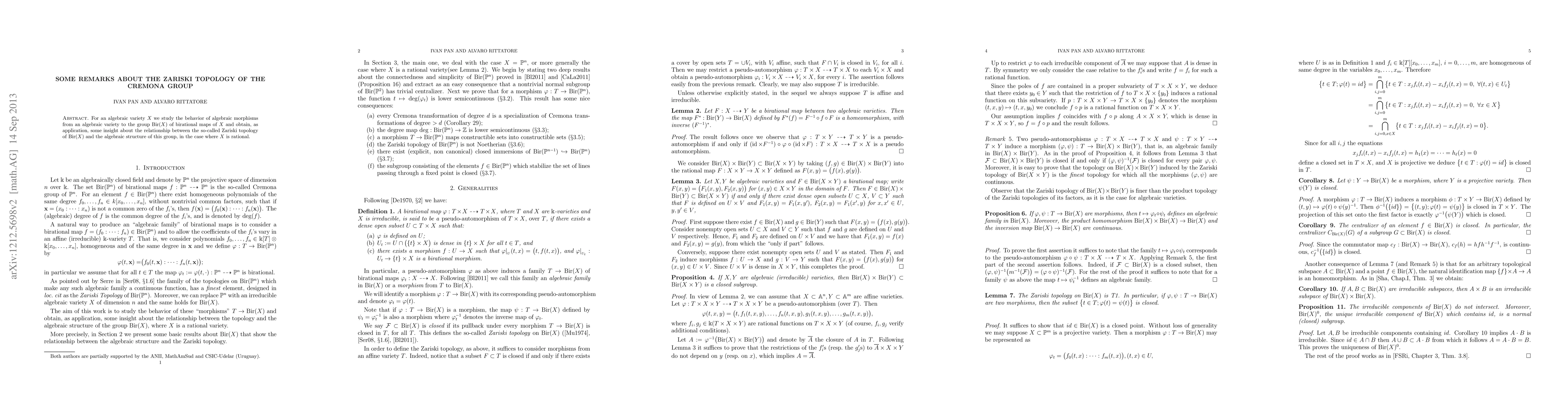 This paper investigates algebraic morphisms from varieties to the group of birational maps of a rational variety, providing insights into the relationship between the Zariski topology of the birational maps group and its algebraic structure. The findings shed light on the interplay between topological and algebraic properties in the context of the Cremona group.