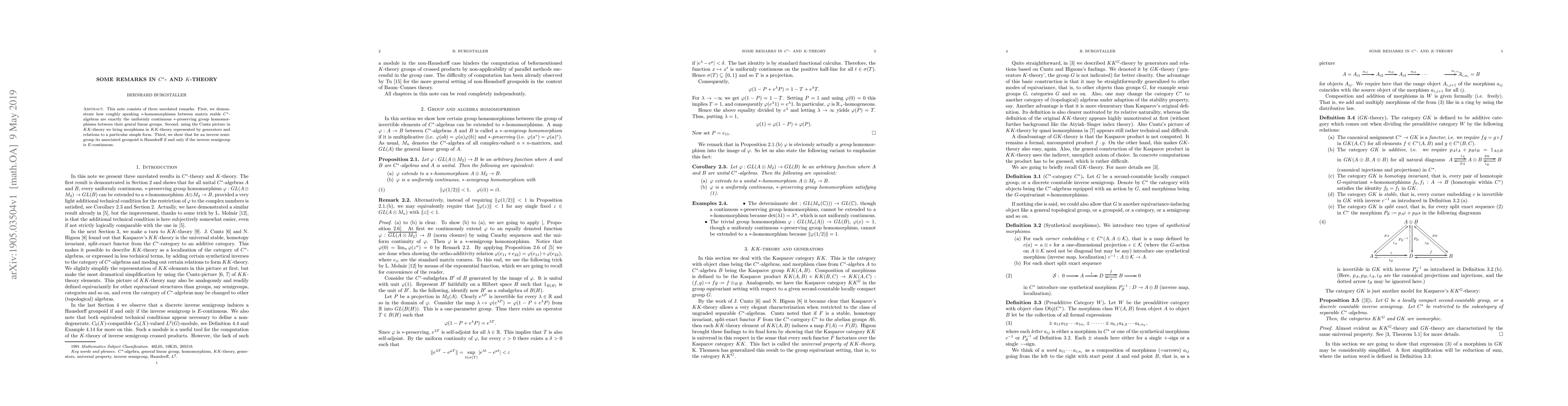 This note consists of three unrelated remarks. First, we demonstrate how roughly speaking $*$-homomorphisms between matrix stable $C^*$-algebras are exactly the uniformly continuous $*$-preserving group homomorphisms between their genral linear groups. Second, using the Cuntz picture in $KK$-theory we bring morphisms in $KK$-theory represented by generators and relations to a particular simple form. Third, we show that for an inverse semigroup its associated groupoid is Hausdorff if and only if the inverse semigroup is $E$-continuous.