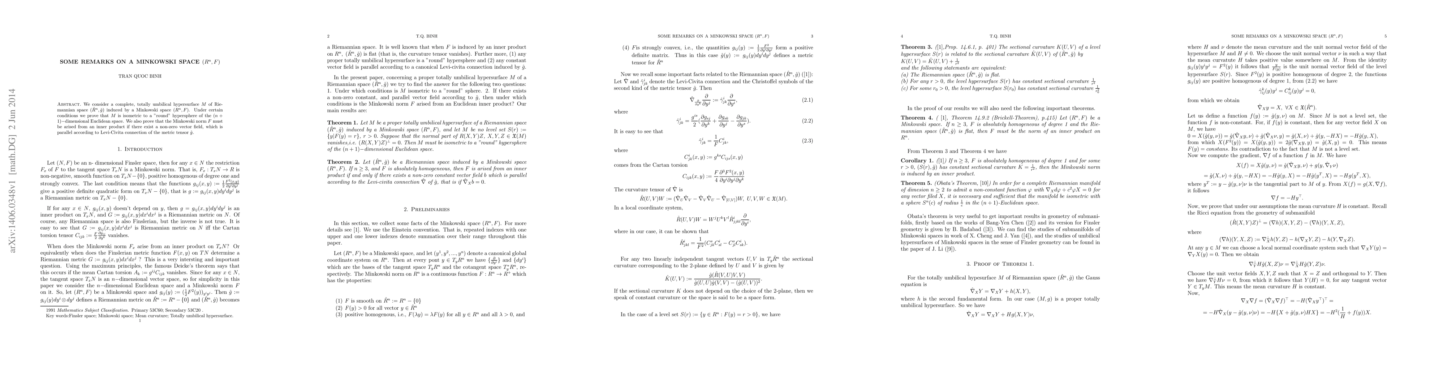 We consider a complete, totally umbilical hypersurface $M$ of Riemannian space $(\hat{R}^n, \hat{g})$ induced by a Minkowski space $(R^n, F)$. Under certain conditions we prove that $M$ is isometric to a "round" hypersphere of the $(n + 1)-$dimensional Euclidean space. We also prove that the Minkowski norm $F$ must be arised from an inner product if there exist a non-zero vector field, which is parallel according to Levi-Civita connection of the metric tensor $\hat{g}$.