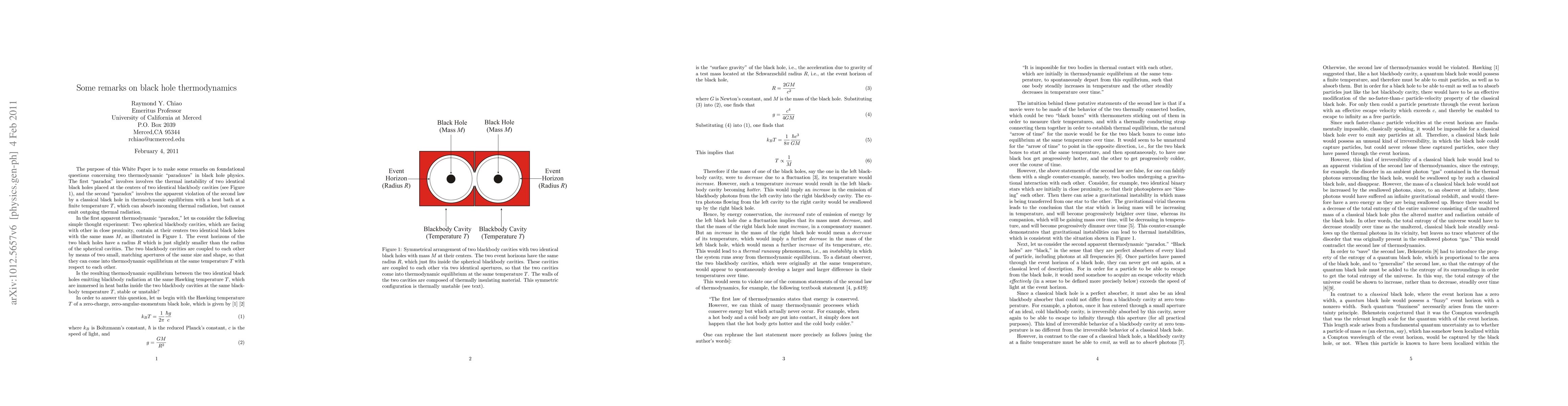 This paper revisits two thermodynamic paradoxes in black hole physics: thermal instability in coupled blackbody cavities and entropy loss without mass increase. It discusses the resolution of these paradoxes, particularly focusing on Hawking radiation and its connection to superluminal tunneling time via Feynman diagrams.