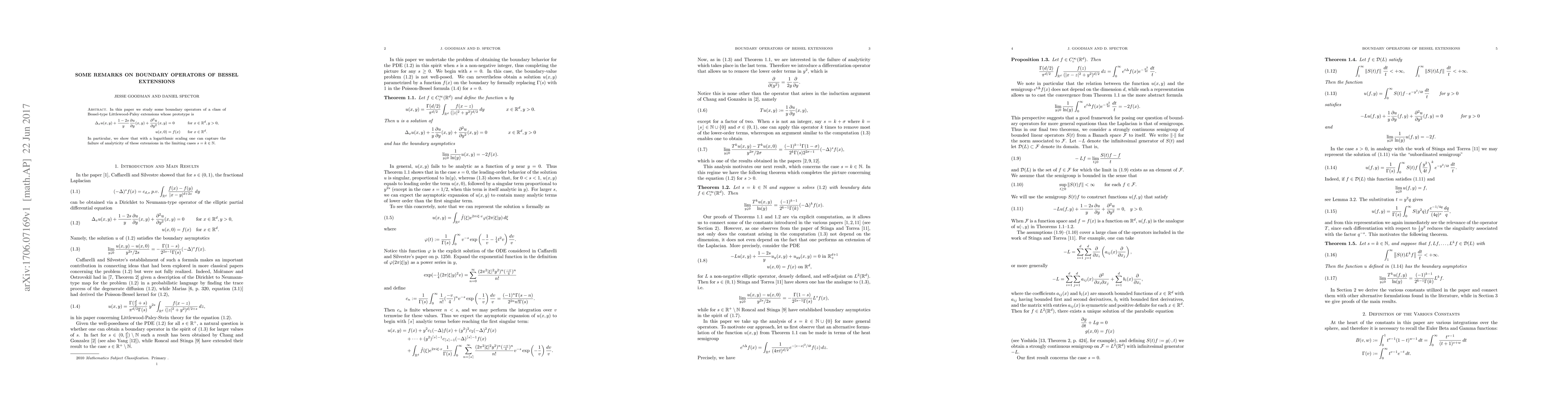 In this paper we study some boundary operators of a class of Bessel-type Littlewood-Paley extensions whose prototype is \[\Delta_x u(x,y) +\frac{1-2s}{y} \frac{\partial u}{\partial y}(x,y)+\frac{\partial^2 u}{\partial y^2}(x,y)=0 \text{ for }x\in\mathbb{R}^d, y>0, \\ u(x,0)=f(x) \text{ for }x\in\mathbb{R}^d. \] In particular, we show that with a logarithmic scaling one can capture the failure of analyticity of these extensions in the limiting cases $s=k \in \mathbb{N}$.