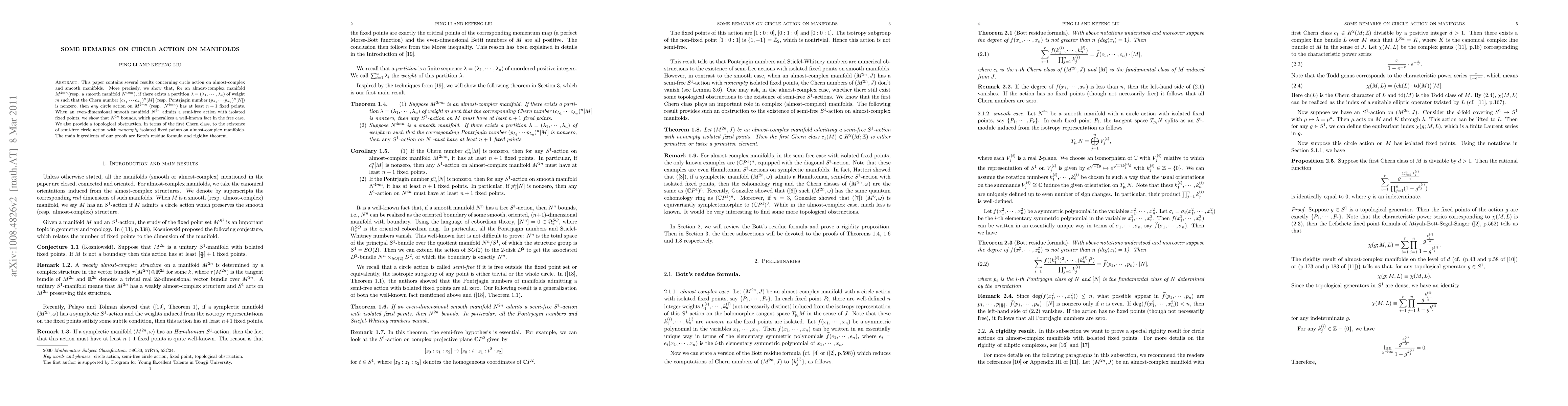 This paper contains several results concerning circle action on almost-complex and smooth manifolds. More precisely, we show that, for an almost-complex manifold $M^{2mn}$(resp. a smooth manifold $N^{4mn}$), if there exists a partition $\lambda=(\lambda_{1},...,\lambda_{u})$ of weight $m$ such that the Chern number $(c_{\lambda_{1}}... c_{\lambda_{u}})^{n}[M]$ (resp. Pontrjagin number $(p_{\lambda_{1}}... p_{\lambda_{u}})^{n}[N]$) is nonzero, then \emph{any} circle action on $M^{2mn}$ (resp. $N^{4mn}$) has at least $n+1$ fixed points. When an even-dimensional smooth manifold $N^{2n}$ admits a semi-free action with isolated fixed points, we show that $N^{2n}$ bounds, which generalizes a well-known fact in the free case. We also provide a topological obstruction, in terms of the first Chern class, to the existence of semi-free circle action with \emph{nonempty} isolated fixed points on almost-complex manifolds. The main ingredients of our proofs are Bott's residue formula and rigidity theorem.