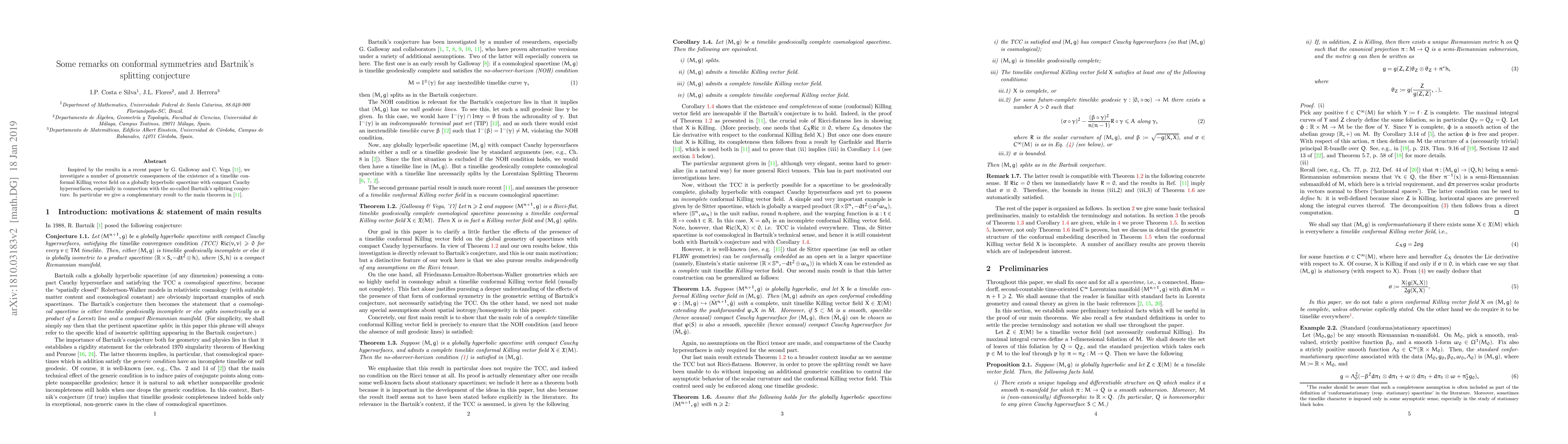 Inspired by the results in a recent paper by G. Galloway and C. Vega (see arXiv:1712.00785), we investigate a number of geometric consequences of the existence of a timelike conformal Killing vector field on a globally hyperbolic spacetime with compact Cauchy hypersurfaces, especially in connection with the so-called Bartnik's splitting conjecture. In particular we give a complementary result to the main theorem in Galloway and Vega's paper.