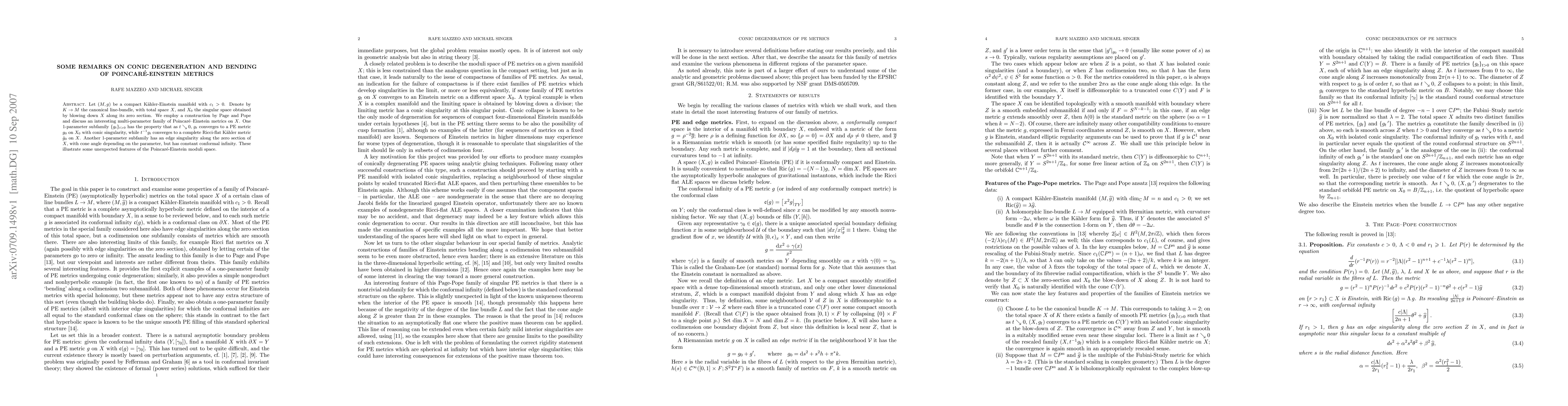Let $(M,g)$ be a compact K\"ahler-Einstein manifold with $c_1 > 0$. Denote by $K\to M$ the canonical line-bundle, with total space $X$, and $X_0$ the singular space obtained by blowing down $X$ along its zero section. We employ a construction by Page and Pope and discuss an interesting multi-parameter family of Poincar\'e--Einstein metrics on $X$. One 1-parameter subfamily $\{g_t\}_{t>0}$ has the property that as $t\searrow 0$, $g_t$ converges to a PE metric $g_0$ on $X_0$ with conic singularity, while $t^{-1}g_t$ converges to a complete Ricci-flat K\"ahler metric $\hat{g}_0$ on $X$. Another 1-parameters subfamily has an edge singularity along the zero section of $X$, with cone angle depending on the parameter, but has constant conformal infinity. These illustrate some unexpected features of the Poincar\'e-Einstein moduli space.
