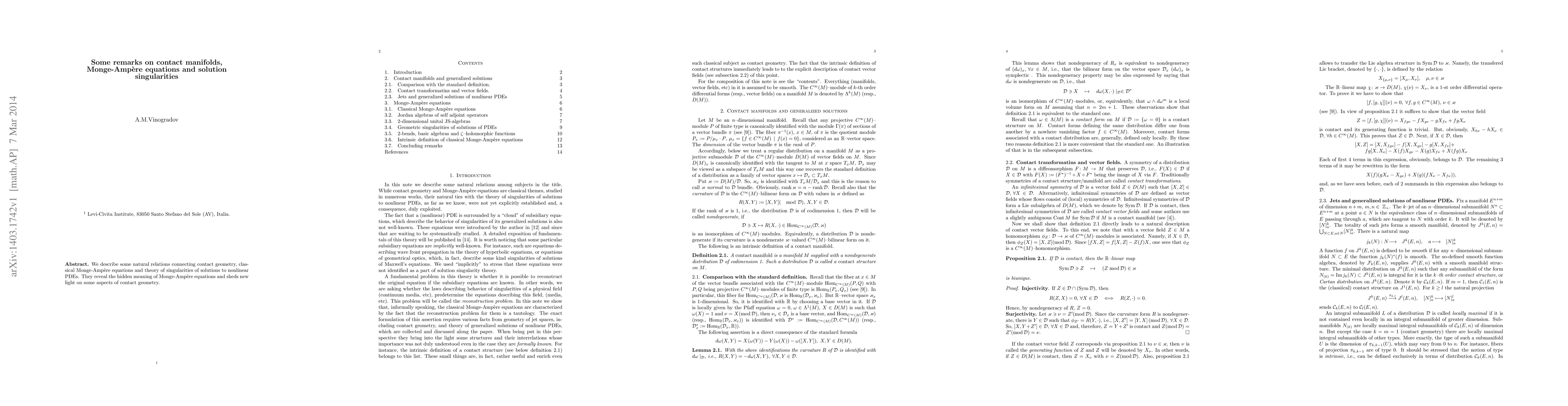 This paper explores connections between contact manifolds, Monge-Ampere equations, and singularities of solutions to nonlinear PDEs, revealing new insights into the nature of Monge-Ampere equations.