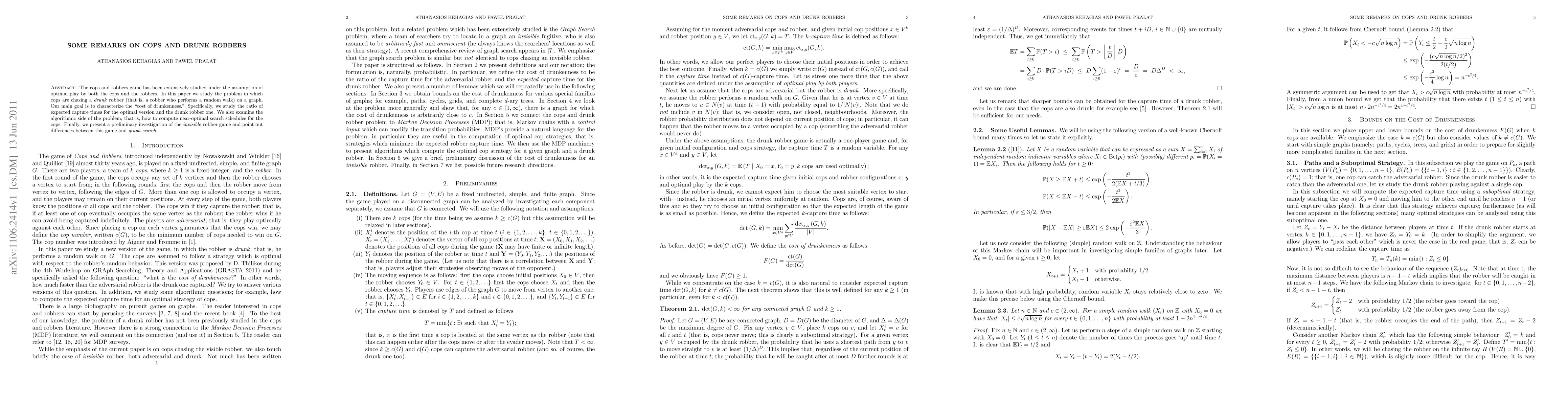 This paper investigates the cops and robbers game where cops chase a drunk robber performing a random walk on a graph, aiming to characterize the "cost of drunkenness" by comparing expected capture times. It also explores algorithmic methods for near-optimal search strategies and briefly examines the invisible robber game.