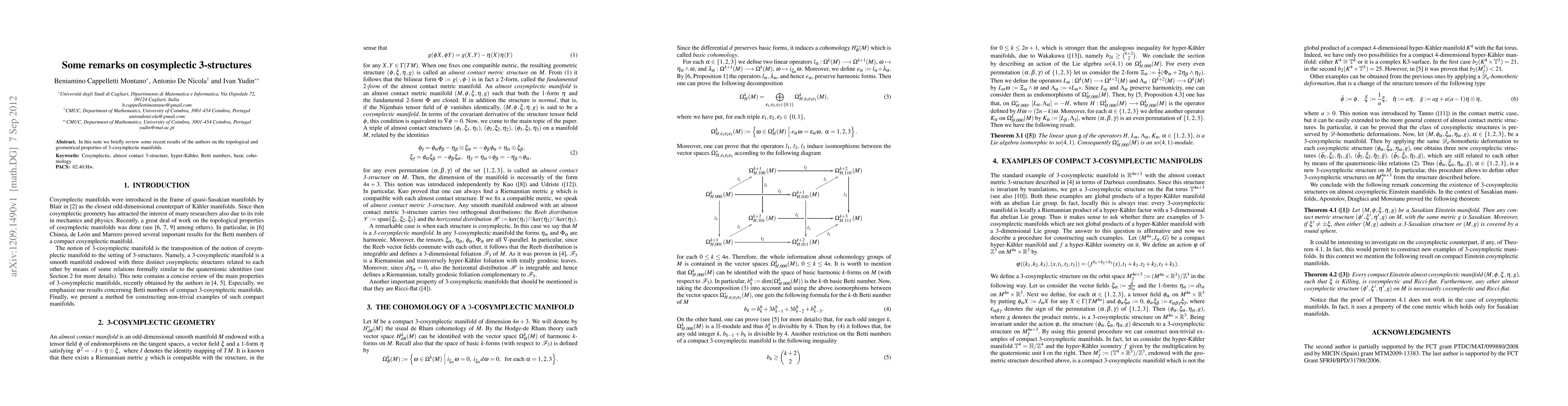 In this note we briefly review some recent results of the authors on the topological and geometrical properties of 3-cosymplectic manifolds.