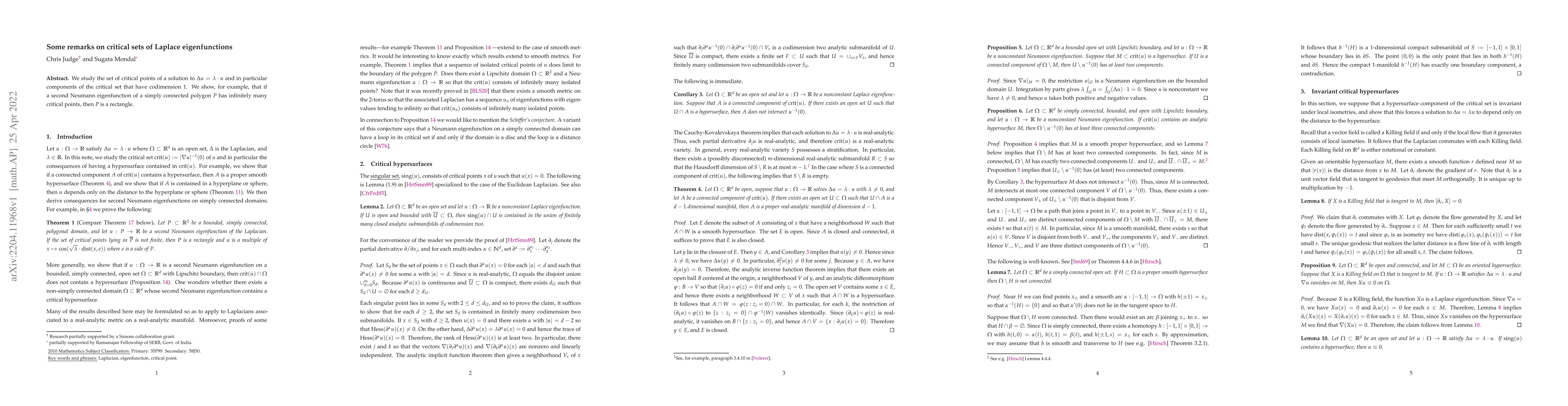 We study the set of critical points of a solution to $\Delta u = \lambda \cdot u$ and in particular components of the critical set that have codimension 1. We show, for example, that if a second Neumann eigenfunction of a simply connected polygon $P$ has infinitely many critical points, then $P$ is a rectangle.