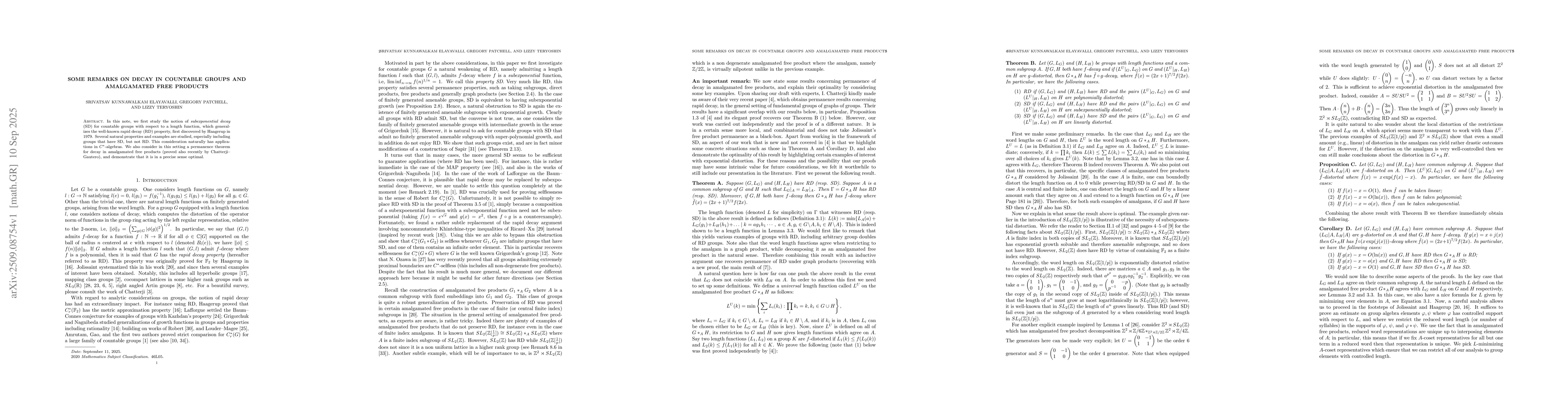 In this note, we first study the notion of subexponential decay (SD) for countable groups with respect to a length function, which generalizes the well-known rapid decay (RD) property, first discovered by Haagerup in 1979. Several natural properties and examples are studied, especially including groups that have SD, but not RD. This consideration naturally has applications in $C^*$-algebras. We also consider in this setting a permanence theorem for decay in amalgamated free products (proved also recently by Chatterji--Gautero), and demonstrate that it is in a precise sense optimal.