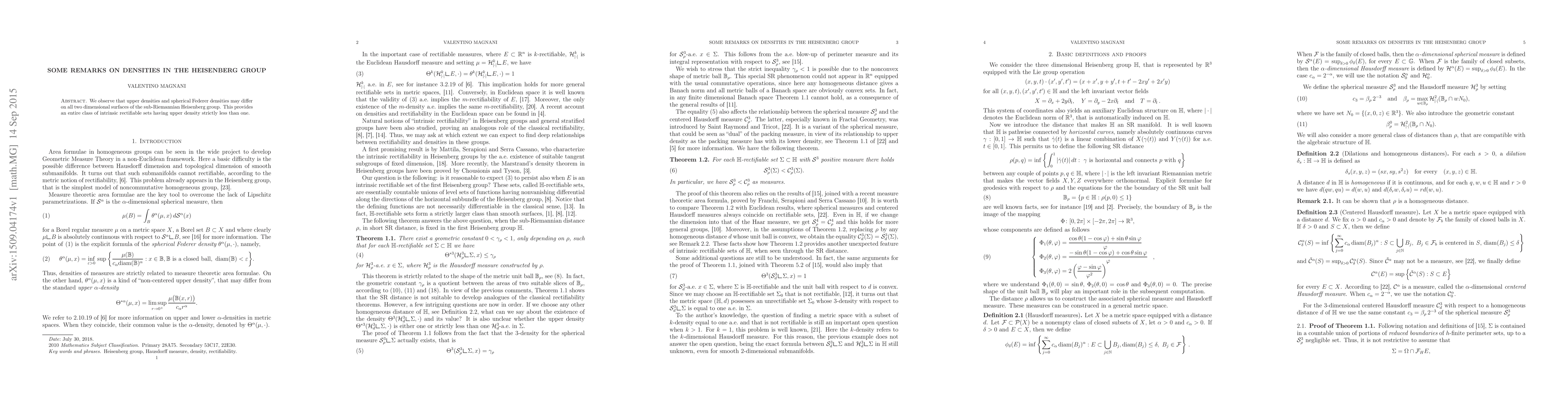 We observe that upper densities and spherical Federer densities may differ on all two dimensional surfaces of the sub-Riemannian Heisenberg group. This provides an entire class of intrinsic rectifiable sets having upper density strictly less than one.
