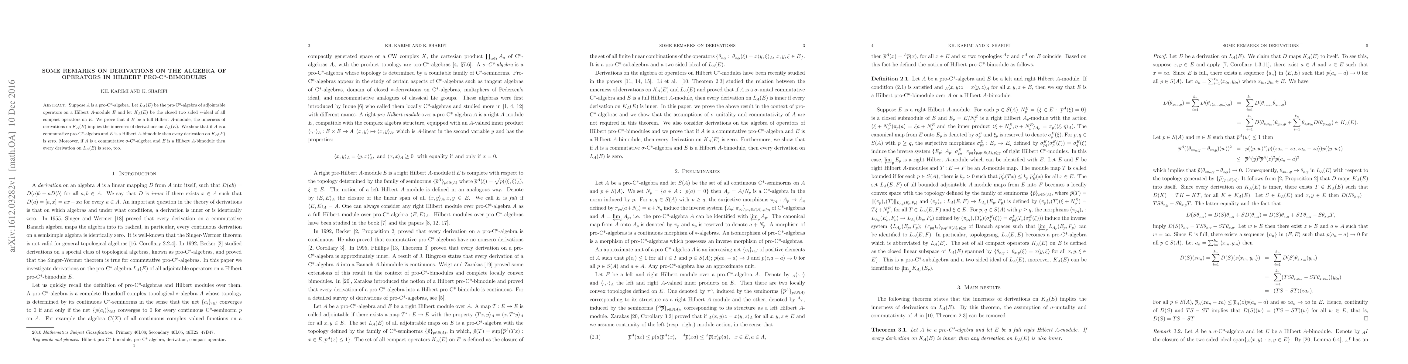 This paper investigates derivations in the algebra of operators on Hilbert pro-C*-bimodules, proving that inner derivations on compact operators imply the same for all adjointable operators if the module is full. It also shows that in commutative cases, all derivations on these operator algebras vanish.