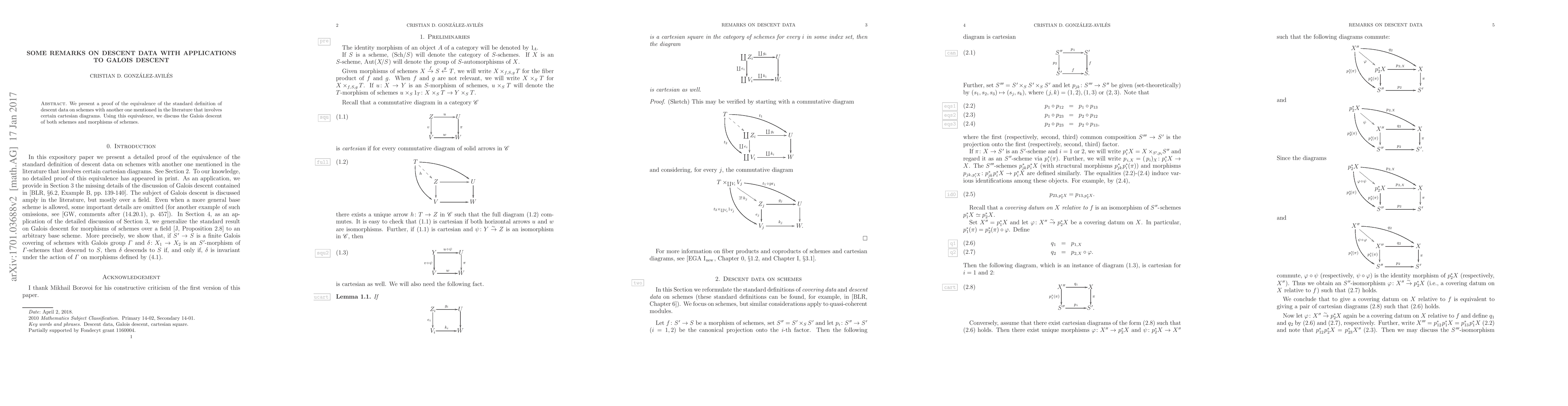In this expository paper we present a proof of the equivalence of the standard definition of descent data on schemes with another one mentioned in the literature that involves certain cartesian diagrams. Using this equivalence, we discuss the Galois descent of both schemes and morphisms of schemes.
