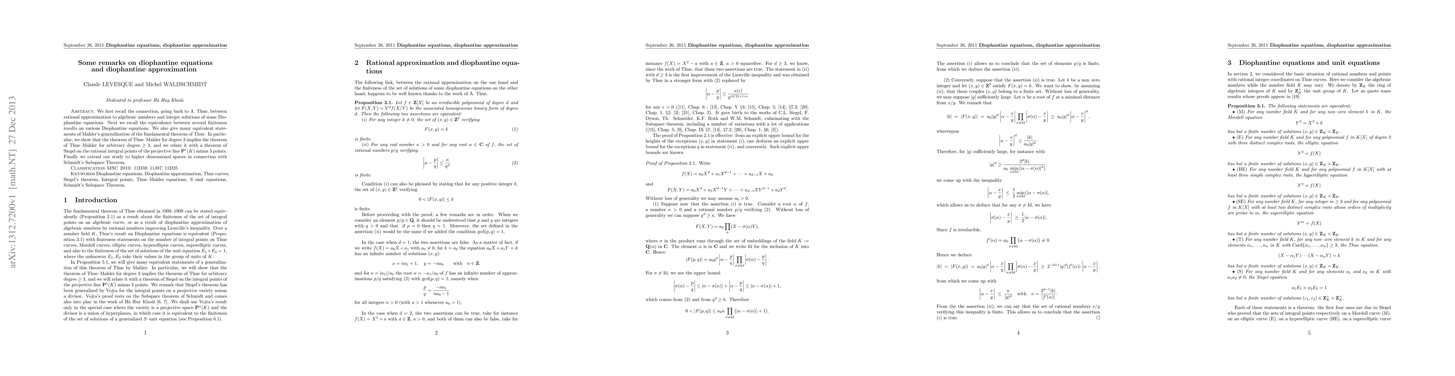 We first recall the connection, going back to A. Thue, between rational approximation to algebraic numbers and integer solutions of some Diophantine equations. Next we recall the equivalence between several finiteness results on various Diophantine equations. We also give many equivalent statements of Mahler's generalization of the fundamental theorem of Thue. In particular, we show that the theorem of Thue--Mahler for degree $3$ implies the theorem of Thue--Mahler for arbitrary degree $\ge3$, and we relate it with a theorem of Siegel on the rational integral points of the projective line $\P^1(K)$ minus $3$ points. Finally we extend our study to higher dimensional spaces in connection with Schmidt's Subspace Theorem.