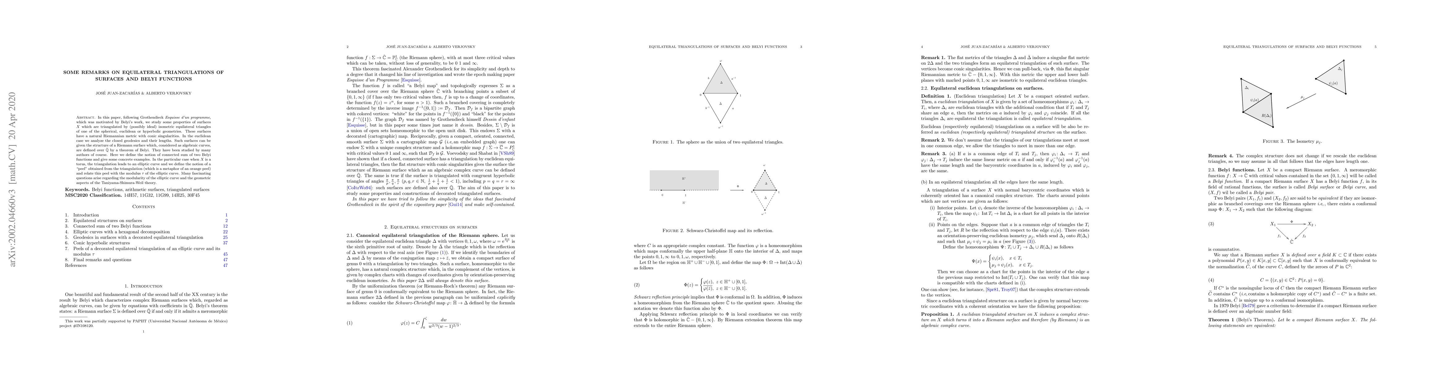 In this paper, following Grothendieck {\it Esquisse d'un programme}, which was motivated by Belyi's work, we study some properties of surfaces $X$ which are triangulated by (possibly ideal) isometric equilateral triangles of one of the spherical, euclidean or hyperbolic geometries. These surfaces have a natural Riemannian metric with conic singularities. In the euclidean case we analyze the closed geodesics and their lengths. Such surfaces can be given the structure of a Riemann surface which, considered as algebraic curves, are defined over $\bar{\mathbb{Q}}$ by a theorem of Belyi. They have been studied by many authors of course. Here we define the notion of connected sum of two Belyi functions and give some concrete examples. In the particular case when $X$ is a torus, the triangulation leads to an elliptic curve and we define the notion of a "peel" obtained from the triangulation (which is a metaphor of an orange peel) and relate this peel with the modulus $\tau$ of the elliptic curve. Many fascinating questions arise regarding the modularity of the elliptic curve and the geometric aspects of the Taniyama-Shimura-Weil theory.