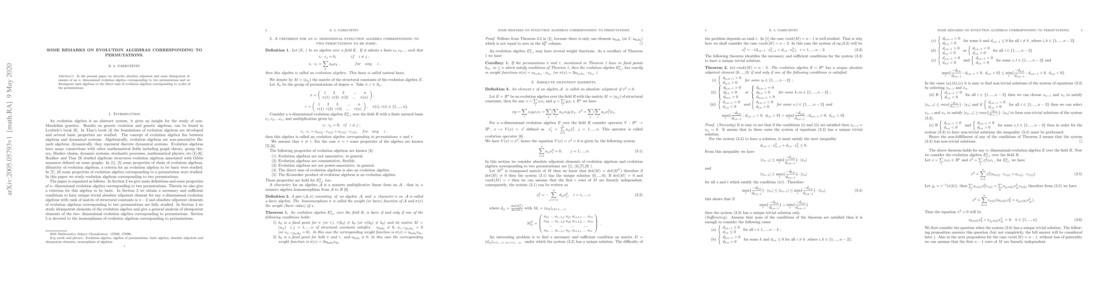 In the present paper we describe absolute nilpotent and some idempotent elements of an n- dimensional evolution algebra corresponding to two permutations and we decompose such algebras to the direct sum of evolution algebras corresponding to cycles of the permutations.