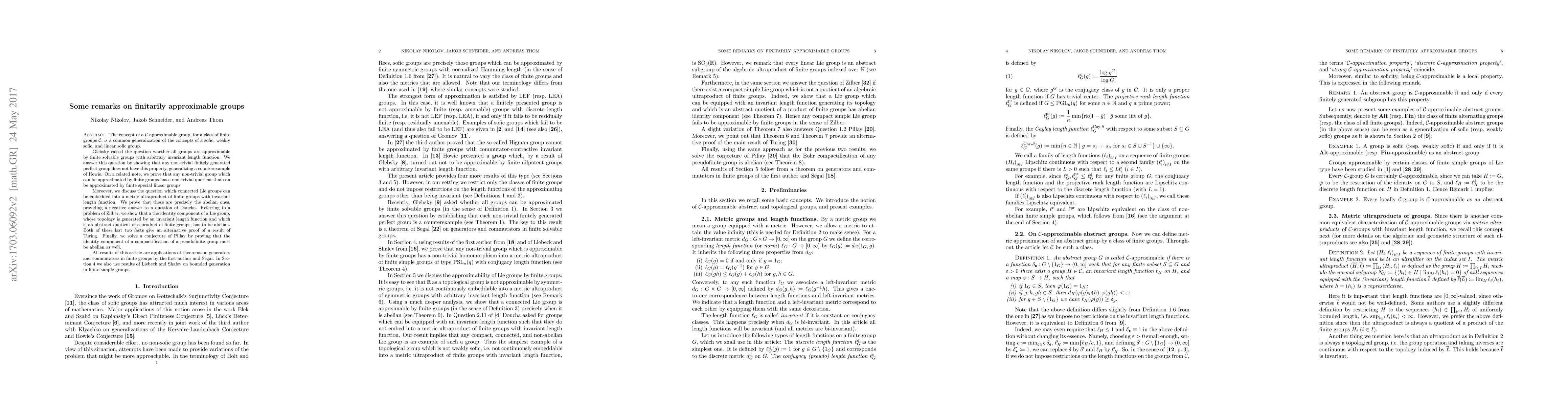 The concept of a C-approximable group, for a class of finite groups C, is a common generalization of the concepts of a sofic, weakly sofic, and linear sofic group. Glebsky raised the question whether all groups are approximable by finite solvable groups with arbitrary invariant length function. We answer this question by showing that any non-trivial finitely generated perfect group does not have this property, generalizing a counterexample of Howie. Moreover, we discuss the question which connected Lie groups can be embedded into a metric ultraproduct of finite groups with invariant length function. We prove that these are precisely the abelian ones, providing a negative answer to a question of Doucha. Referring to a problem of Zilber, we show that a the identity component of a Lie group, whose topology is generated by an invariant length function and which is an abstract quotient of a product of finite groups, has to be abelian. Both of these last two facts give an alternative proof of a result of Turing. Finally, we solve a conjecture of Pillay by proving that the identity component of a compactification of a pseudofinite group must be abelian as well. All results of this article are applications of theorems on generators and commutators in finite groups by the first author and Segal.