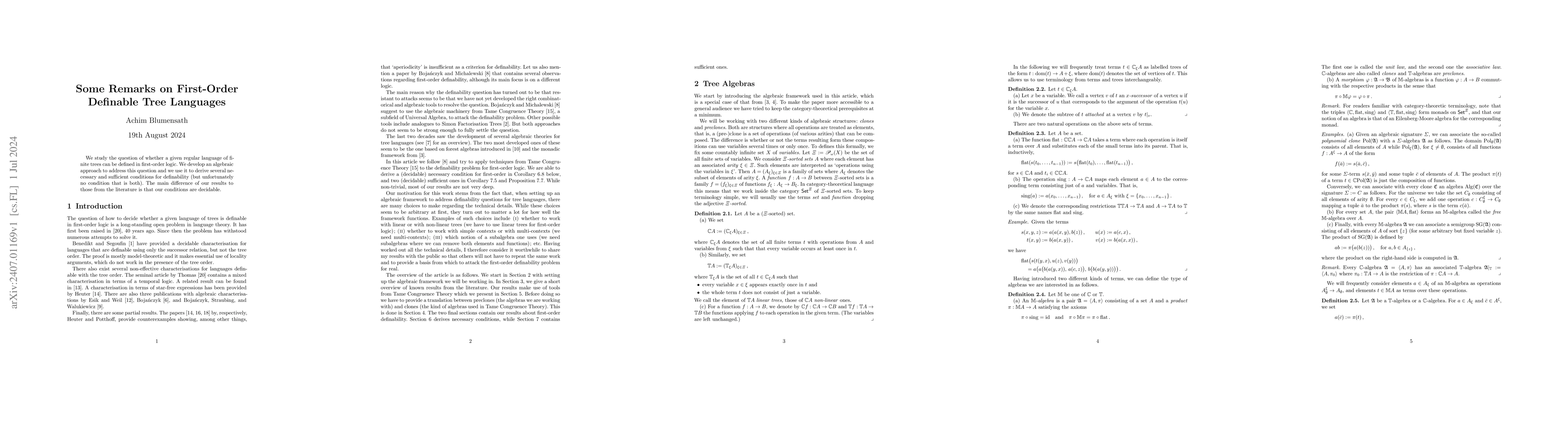 This paper explores whether regular languages of finite trees can be defined in first-order logic, presenting an algebraic approach that provides necessary and sufficient decidable conditions for definability, differing from previous literature.
