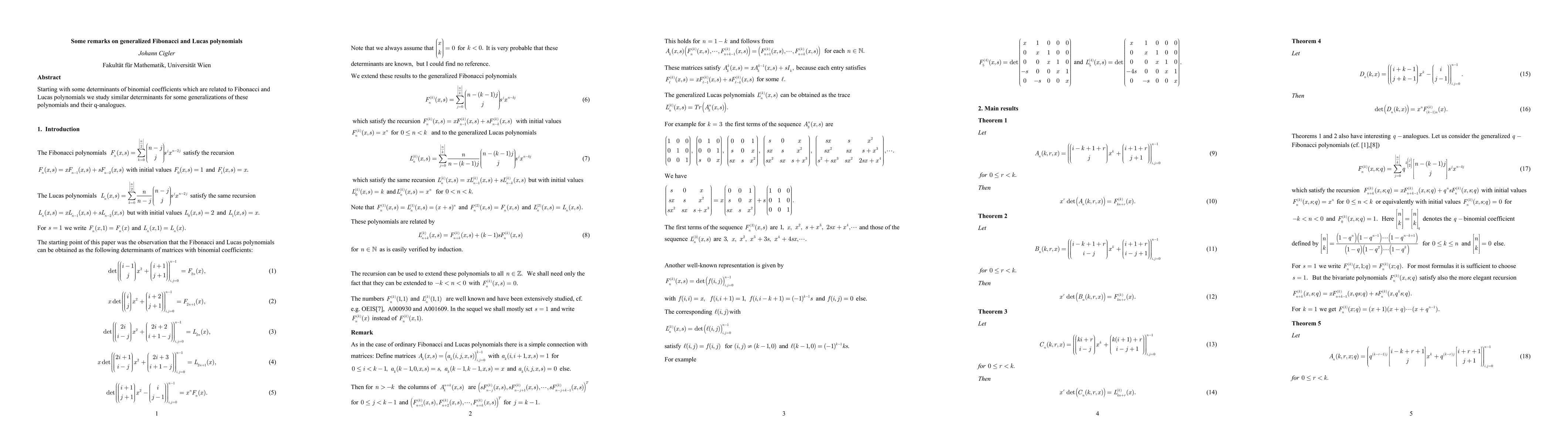 Starting with some determinants of binomial coefficients which are related to Fibonacci and Lucas polynomials we study similar determinants for some generalizations of these polynomials and their q-analogues.