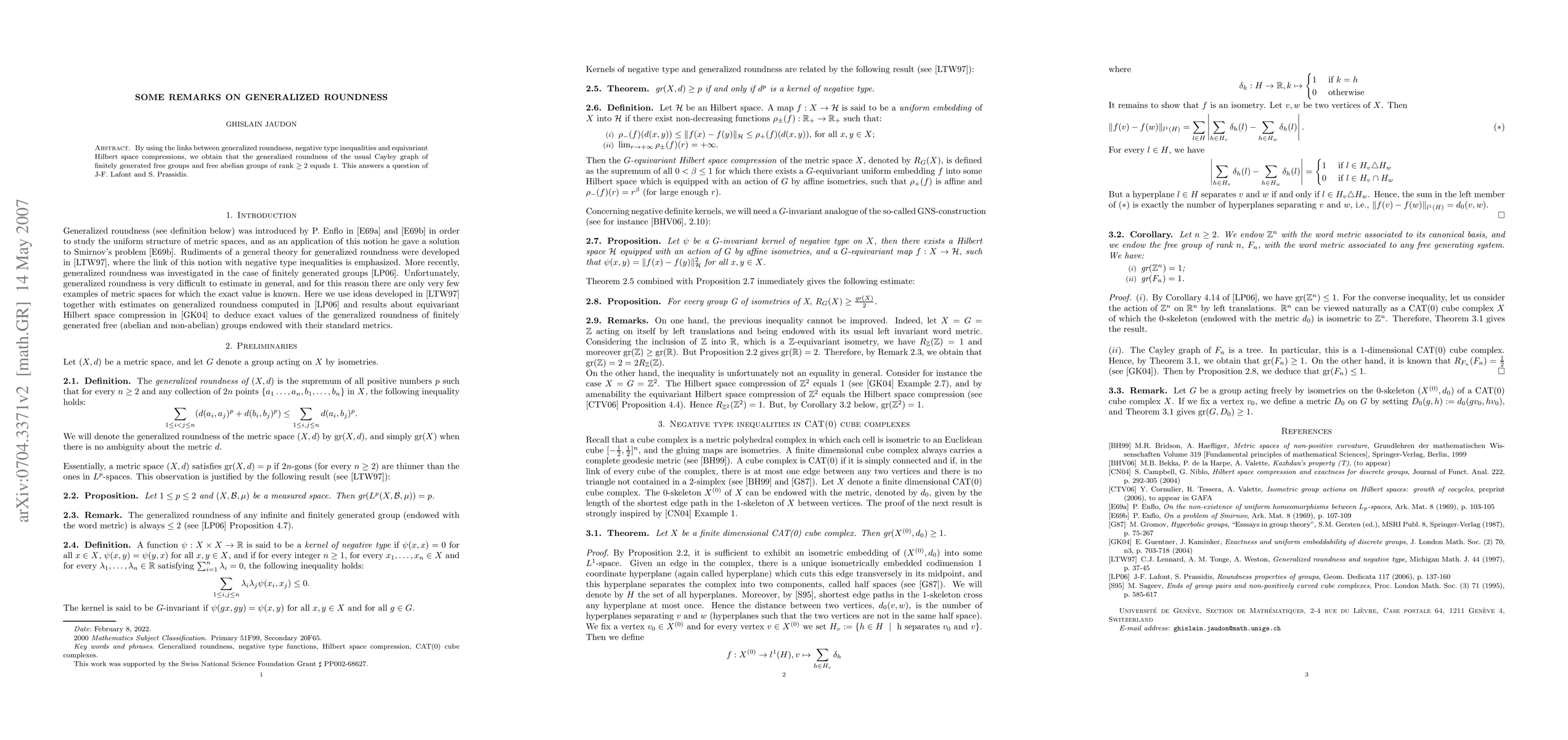 Summary: The paper establishes that the generalized roundness of the Cayley graphs of finitely generated free groups and free abelian groups of rank $\geq 2$ is 1, utilizing connections with negative type inequalities and equivariant Hilbert space compressions, thus resolving a question posed by J-F. Lafont and S. Prassidis.