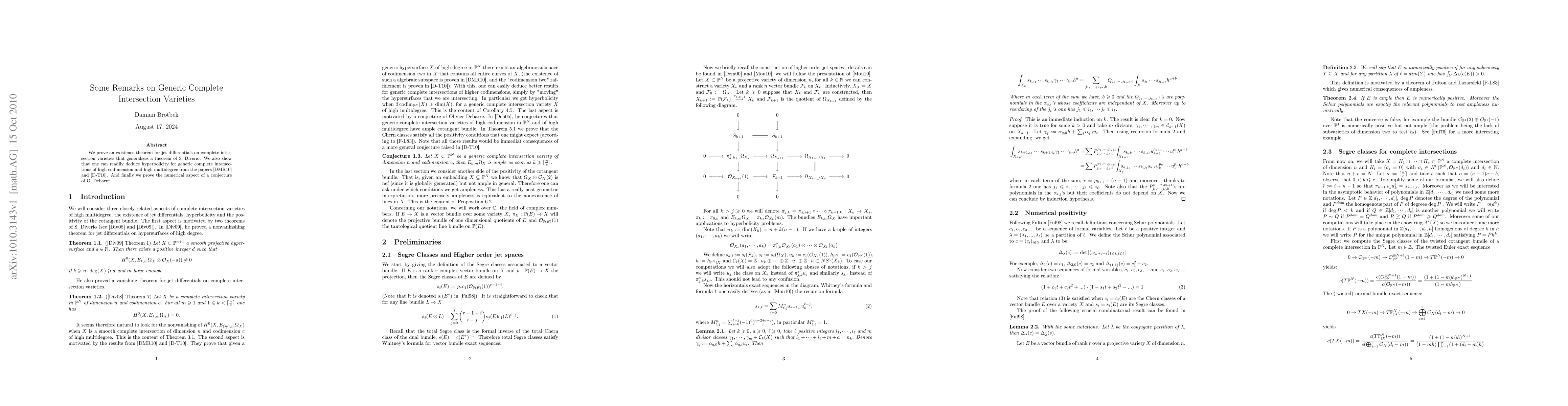 This paper establishes an existence theorem for jet differentials on complete intersection varieties, extends earlier work to deduce hyperbolicity for generic high multidegree intersections, and verifies a numerical conjecture by O. Debarre.