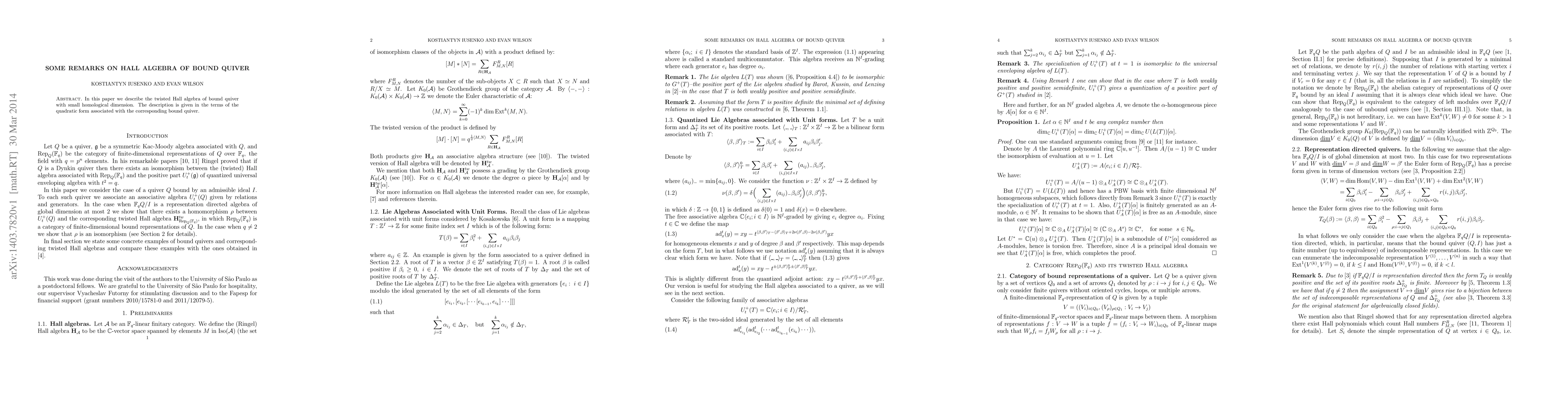 Summary: This paper explores the twisted Hall algebra of bound quivers with minimal homological dimension, presenting its description through the quadratic form linked to the bound quiver.