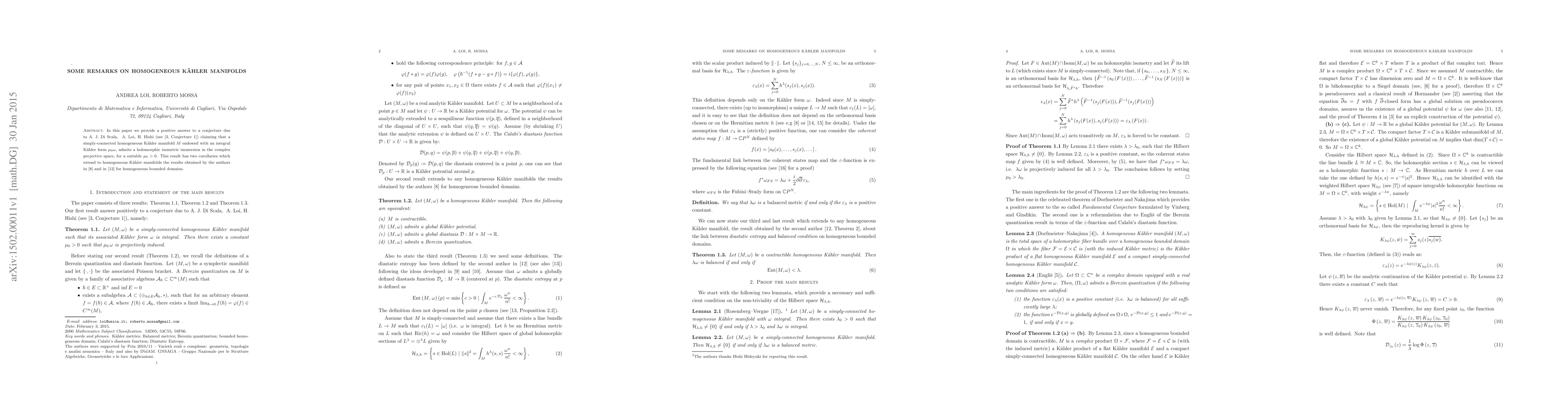 In this paper we provide a positive answer to a conjecture due to A. J. Di Scala, A. Loi, H. Hishi (see [3, Conjecture 1]) claiming that a simply-connected homogeneous K\"ahler manifold M endowed with an integral K\"ahler form $\mu\omega$, admits a holomorphic isometric immersion in the complex projective space, for a suitable $\mu>0$. This result has two corollaries which extend to homogeneous K\"ahler manifolds the results obtained by the authors in [8] and in [12] for homogeneous bounded domains.