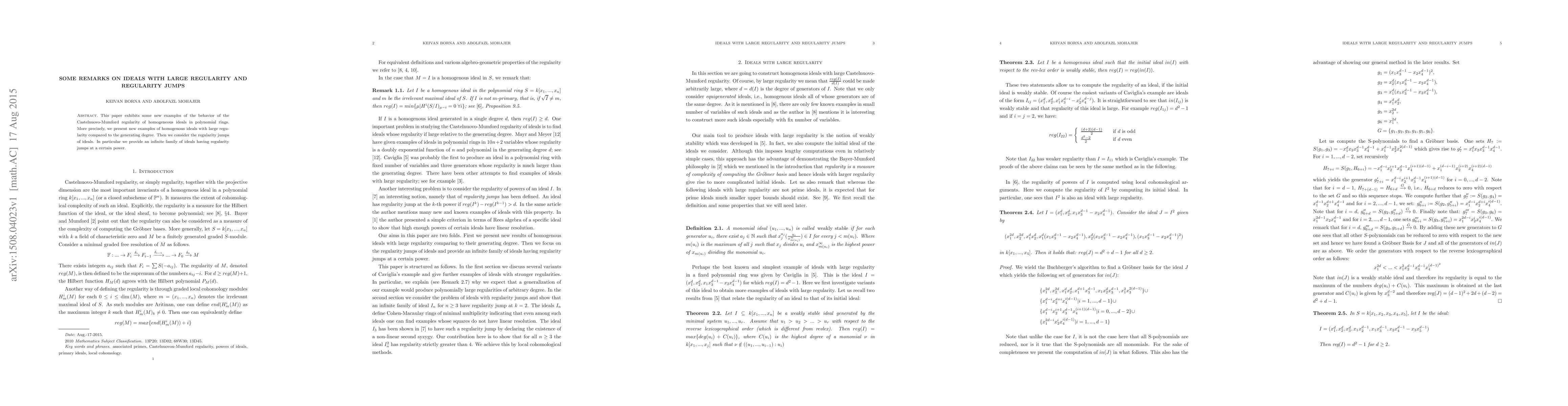 This paper presents new examples of homogeneous ideals with large regularity compared to their generating degree, and discovers infinite families of ideals experiencing regularity jumps at a certain power.