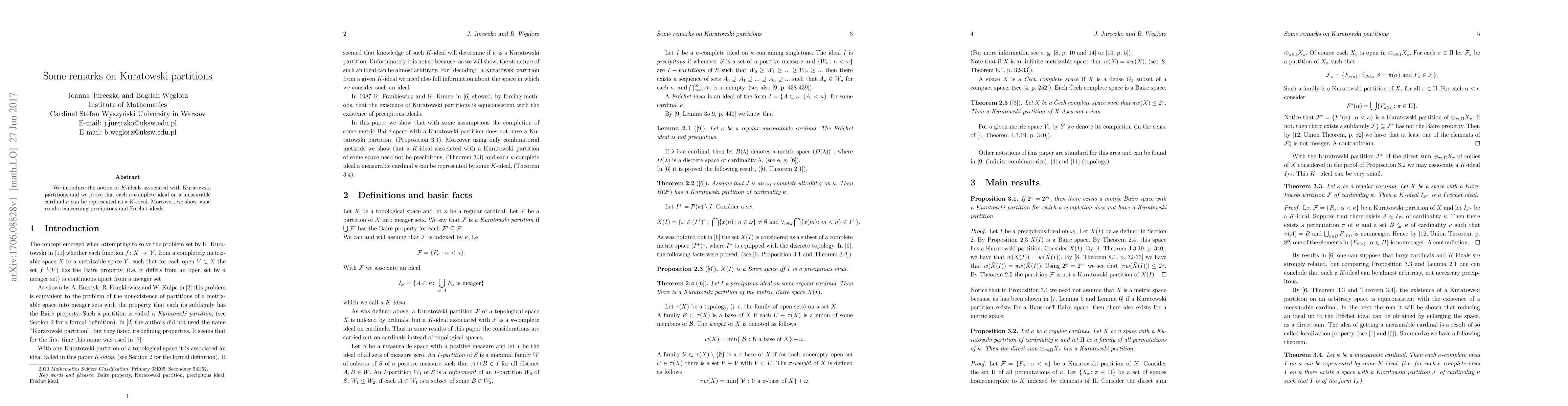 The paper introduces K-ideals associated with Kuratowski partitions and proves that each κ-complete ideal on a measurable cardinal κ can be represented as a K-ideal. It uses both forcing methods and combinatorial arguments to establish results concerning precipitous and Fréchet ideals.