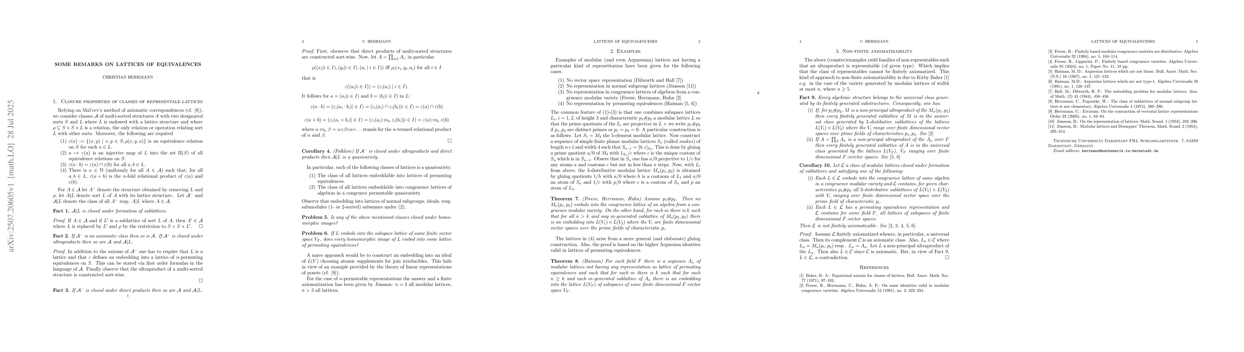 The paper presents detailed analysis and proof of axiomatizability for specific classes of lattices of equivalences, along with counterexamples demonstrating non-finite axiomatizability.