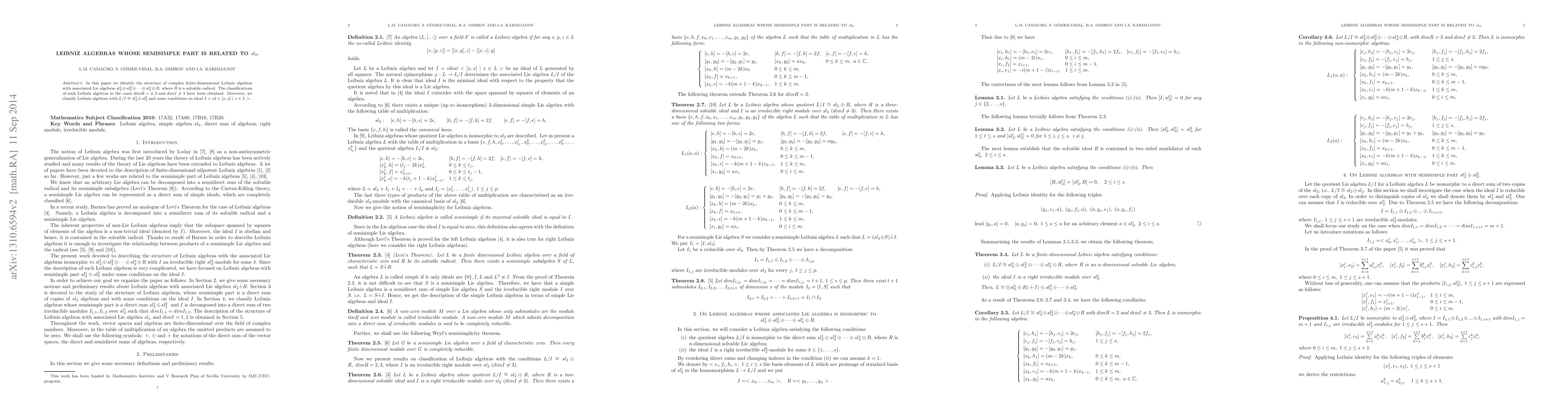 In this paper we identify the structure of complex finite-dimensional Leibniz algebras with associated Lie algebras $sl_2^1\oplus sl_2^2\oplus \dots \oplus sl_2^s\oplus R,$ where $R$ is a solvable radical. The classifications of such Leibniz algebras in the cases $dim R=2, 3$ and $dim I\neq 3$ have been obtained. Moreover, we classify Leibniz algebras with $L/I\cong sl_2^1\oplus sl_2^2$ and some conditions on ideal $I=id<[x,x] \ | \ x\in L>.$