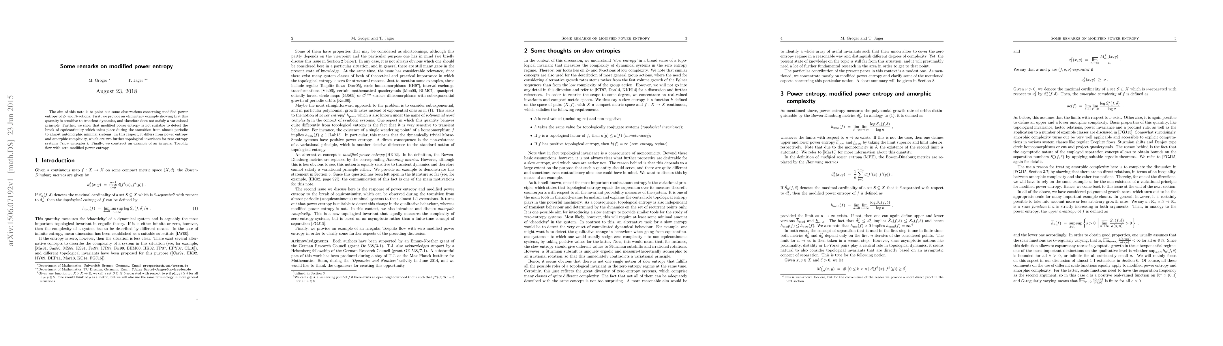 This paper discusses the limitations of modified power entropy in $\Z$- and $\N$-actions, demonstrating its sensitivity to transient dynamics and its inability to detect equicontinuity breaks. It concludes with an example of an irregular Toeplitz flow with zero modified power entropy.
