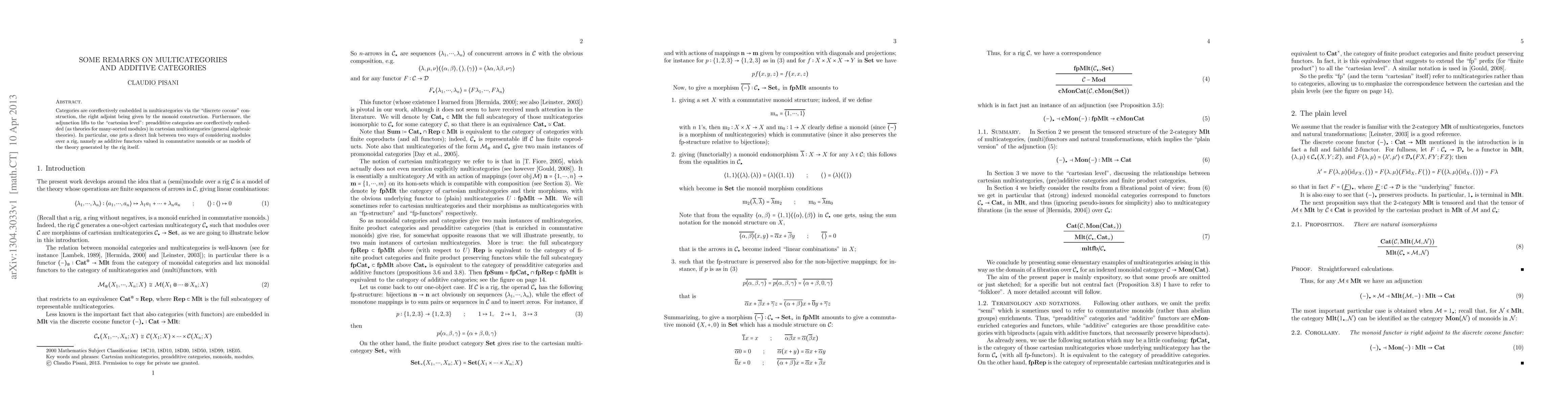 This paper explores the embedding of categories into multicategories through the discrete cocone construction, highlighting an adjunction that extends to preadditive categories and cartesian multicategories. It establishes a connection between modules over rigs as additive functors and as models of algebraic theories.