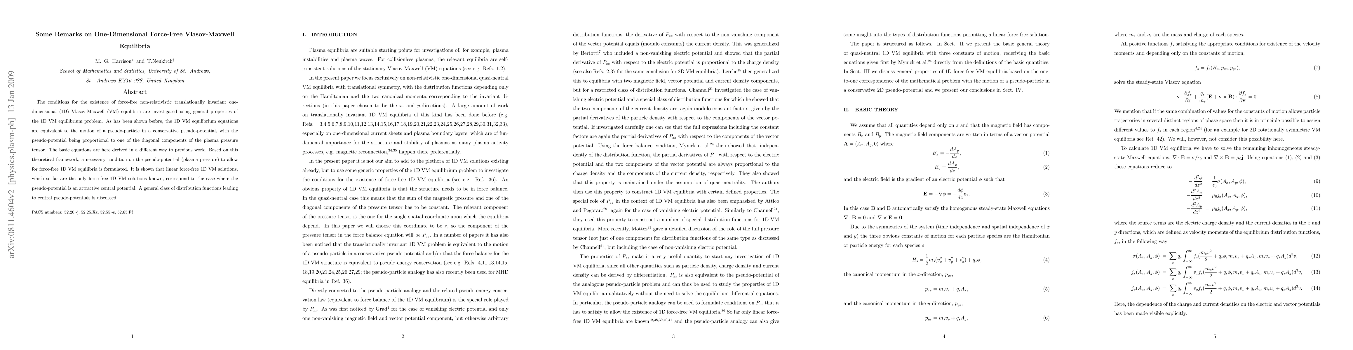 This paper explores the existence of force-free, non-relativistic, one-dimensional Vlasov-Maxwell equilibria, deriving the basic equations differently from prior work and establishing a necessary condition for the pseudo-potential. It reveals that known linear force-free solutions correspond to attractive central potentials.