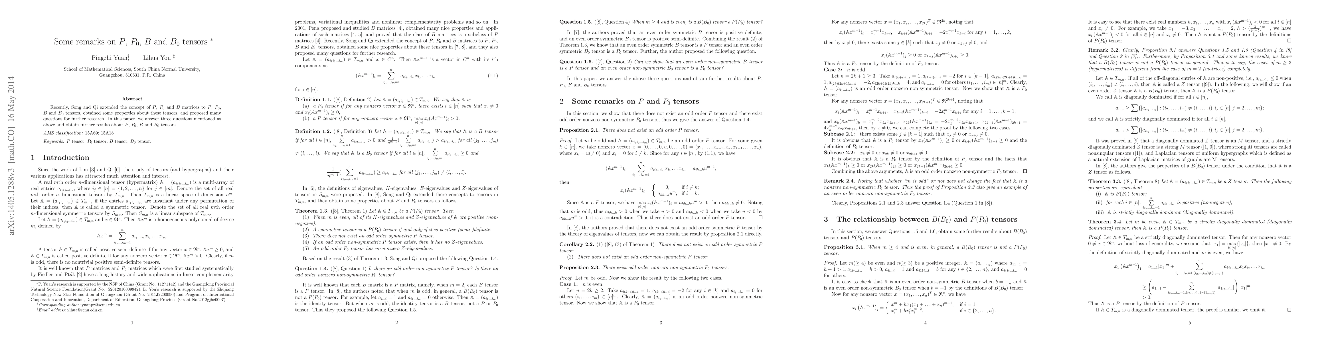 Recently, Song and Qi extended the concept of P, P_0 and B matrices to P, P_0, B and B_0 tensors, obtained some properties about these tensors, and proposed many questions for further research. In this paper, we answer three questions mentioned as above and obtain further results about P, P_0, B and B_0 tensors.