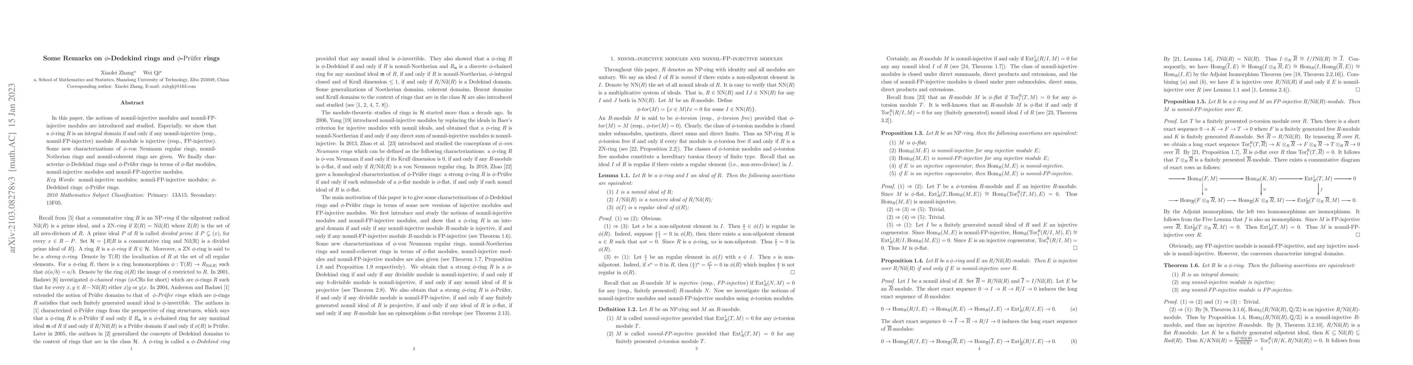 This paper introduces the concepts of nonnil-injective and nonnil-FP-injective modules, demonstrating that a $\phi$-ring $R$ is an integral domain if any such module is injective or FP-injective. It also provides new characterizations of $\phi$-von Neumann regular rings, nonnil-Noetherian rings, and nonnil-coherent rings, and characterizes $\phi$-Dedekind and $\phi$-Prufer rings via $\phi$-flat modules, nonnil-injective modules, and nonnil-FP-injective modules.