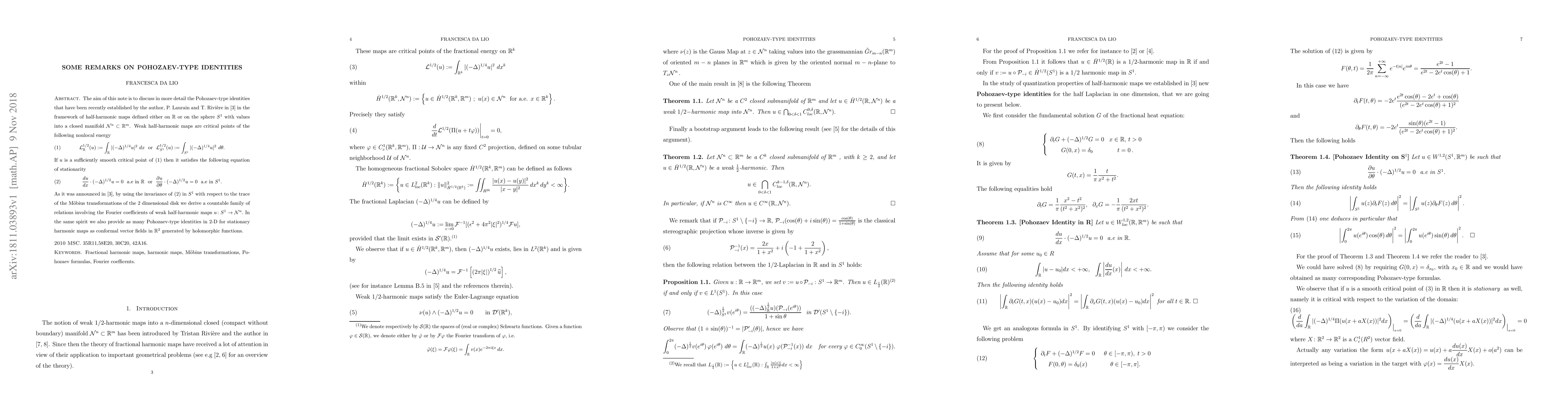The aim of this note is to discuss in more detail the Pohozaev-type identities that have been recently obtained by the author, Paul Laurain and Tristan Rivi\`ere in the framework of half-harmonic maps defined either on $R$ or on the sphere $S^1$ with values into a closed manifold $N^n\subset R^m$. Weak half-harmonic maps are critical points of the following nonlocal energy $$\int_{R}|(-\Delta)^{1/4}u|^2 dx~~\mbox{or}~~\int_{S^1}|(-\Delta)^{1/4}u|^2\ d\theta.$$ If $u$ is a sufficiently smooth critical point of the above energy then it satisfies the following equation of stationarity $$\frac{du}{dx}\cdot (-\Delta)^{1/2} u=0~~\mbox{a.e in $R$}~~\mbox{or}~~\frac{\partial u}{\partial \theta}\cdot (-\Delta)^{1/2} u=0~~\mbox{a.e in $S^1$.}$$ By using the invariance of the equation of stationarity in $S^1$ with respect to the trace of the M\"obius transformations of the $2$ dimensional disk we derive a countable family of relations involving the Fourier coefficients of weak half-harmonic maps $u\colon S^1\to N^n.$ In the same spirit we also provide as many Pohozaev-type identities in $2$-D for stationary harmonic maps as conformal vector fields in $R^2$ generated by holomorphic functions.