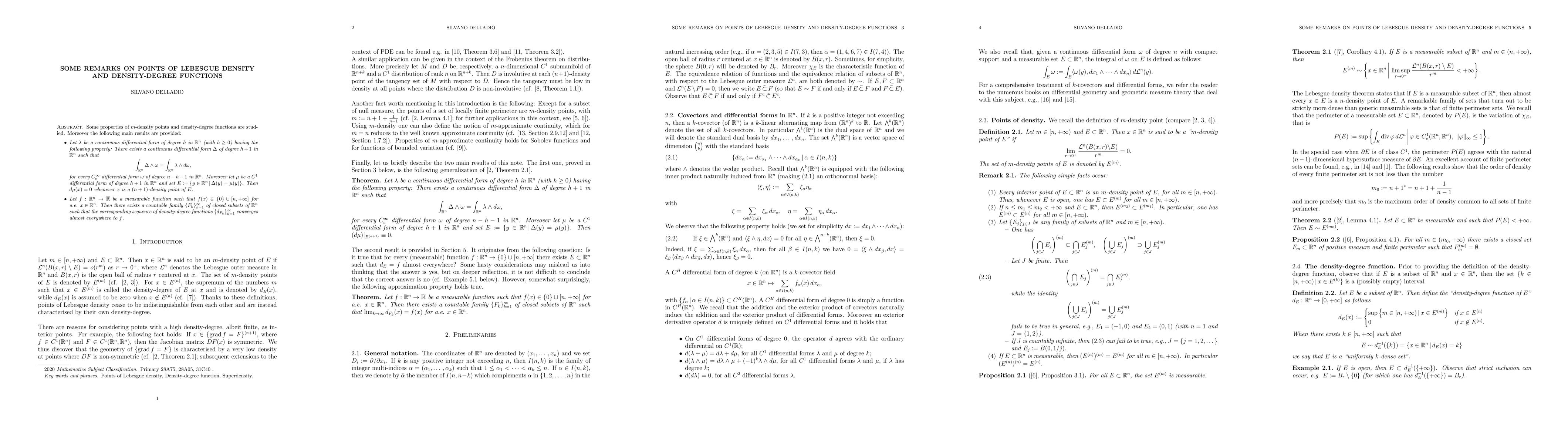 Some properties of $m$-density points and density-degree functions are studied. Moreover the following main results are provided: \vskip2mm \begin{itemize} \item {\it Let $\lambda$ be a continuous differential form of degree $h$ in ${\mathbf R}^n$ (with $h\geq 0$) having the following property: There exists a continuous differential form $\Delta$ of degree $h+1$ in $\rn^n$ such that \begin{equation*} \int_{{\mathbf R}^n}\Delta\wedge\omega =\int_{{\mathbf R}^n}\lambda\wedge d\omega, \end{equation*} for every $C^\infty_c$ differential form $\omega$ of degree $n-h-1$ in ${\mathbf R}^n$. Moreover let $\mu$ be a $C^1$ differential form of degree $h+1$ in ${\mathbf R}^n$ and set $E:=\{y\in {\mathbf R}^n\,\vert\, \Delta (y)=\mu(y)\}$. Then $d\mu (x) = 0$ whenever $x$ is a $(n+1)$-density point of $E$.} \vskip2mm \item {\it Let $f:{\mathbf R}^n\to\overline {\mathbf R}$ be a measurable function such that $f(x)\in \{0\}\cup [n,+\infty]$ for a.e. $x\in {\mathbf R}^n$. Then there exists a countable family $\{F_k\}_{k=1}^\infty$ of closed subsets of ${\mathbf R}^n$ such that the corresponding sequence of density-degree functions $\{d_{F_k}\}_{k=1}^\infty$ converges almost everywhere to $f$. }
