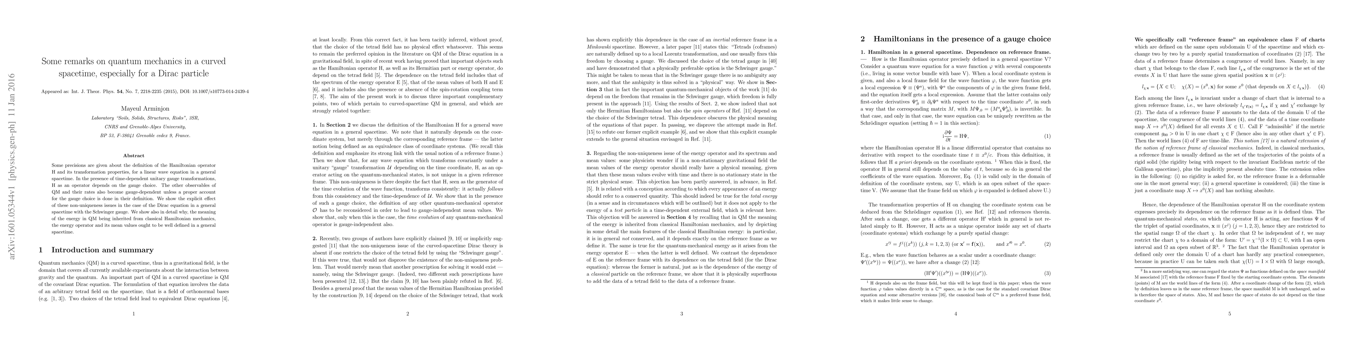 Some precisions are given about the definition of the Hamiltonian operator H and its transformation properties, for a linear wave equation in a general spacetime. In the presence of time-dependent unitary gauge transformations, H as an operator depends on the gauge choice. The other observables of QM and their rates also become gauge-dependent unless a proper account for the gauge choice is done in their definition. We show the explicit effect of these non-uniqueness issues in the case of the Dirac equation in a general spacetime with the Schwinger gauge. We show also in detail why, the meaning of the energy in QM being inherited from classical Hamiltonian mechanics, the energy operator and its mean values ought to be well defined in a general spacetime.