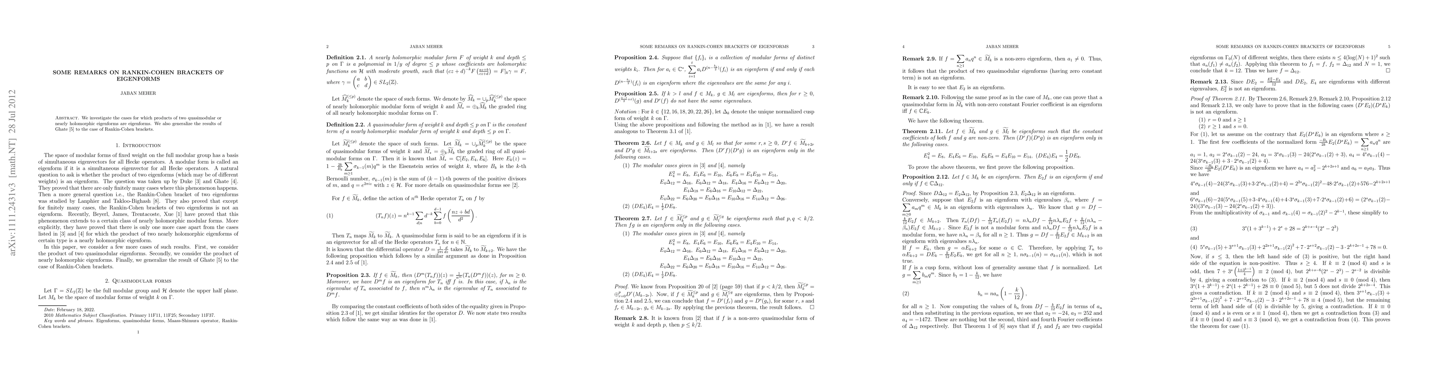 Summary: This paper explores conditions under which products of quasimodular or nearly holomorphic eigenforms yield eigenforms, extending Ghate's prior findings to the context of Rankin-Cohen brackets.