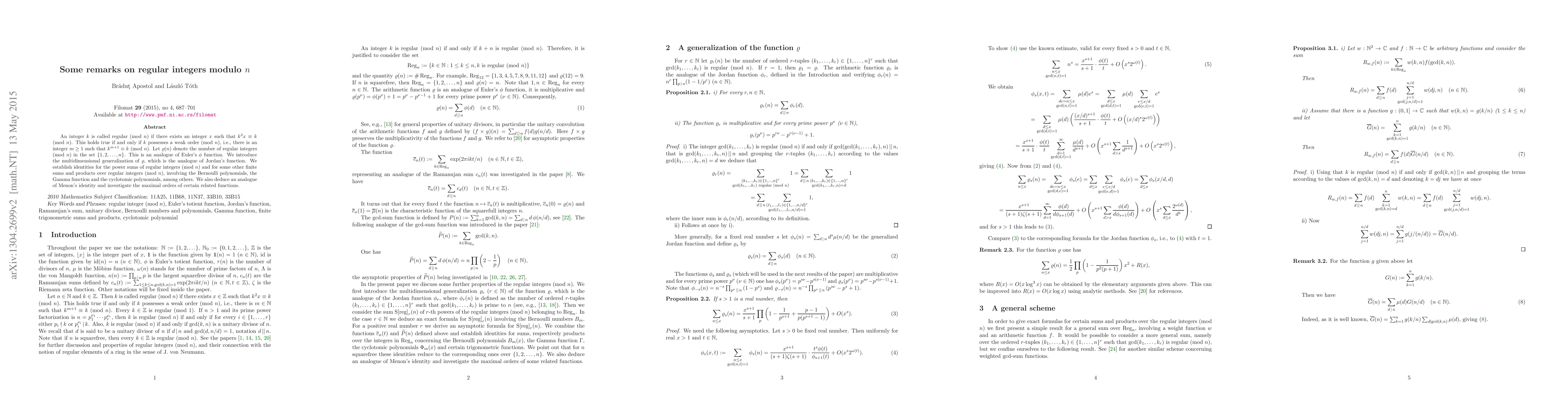 This paper explores the concept of regular integers modulo $n$, establishing their connection to weak orders and introducing $\varrho(n)$ as a function analogous to Euler's $\phi$ function. It also generalizes $\varrho$ and investigates identities involving sums, products, and functions like Bernoulli polynomials and cyclotomic polynomials.