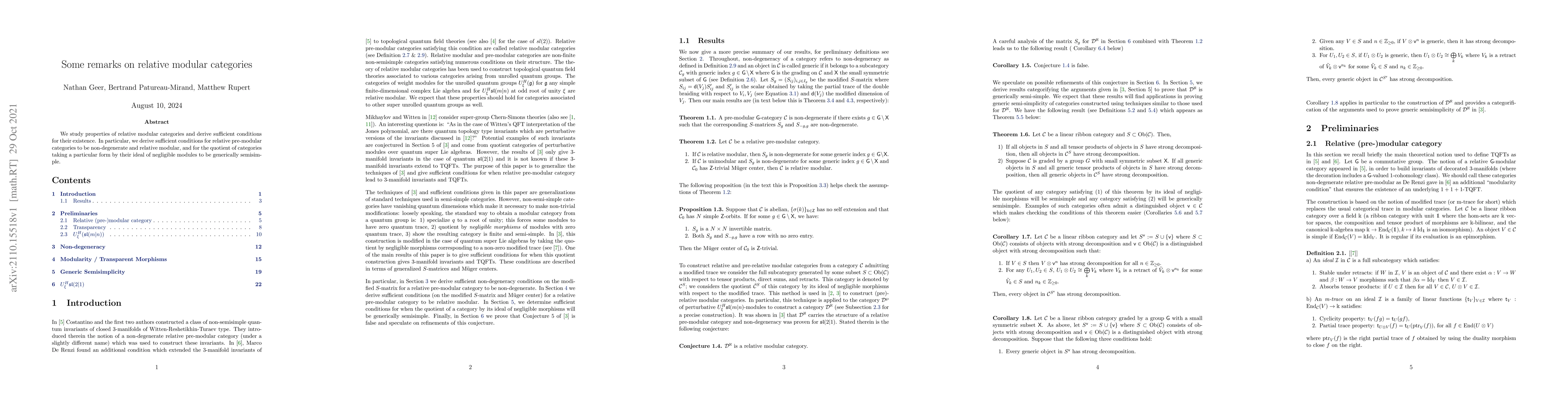 We study properties of relative modular categories and derive sufficient conditions for their existence. In particular, we derive sufficient conditions for relative pre-modular categories to be non-degenerate and relative modular, and for the quotient of categories taking a particular form by their ideal of negligible modules to be generically semi-simple.