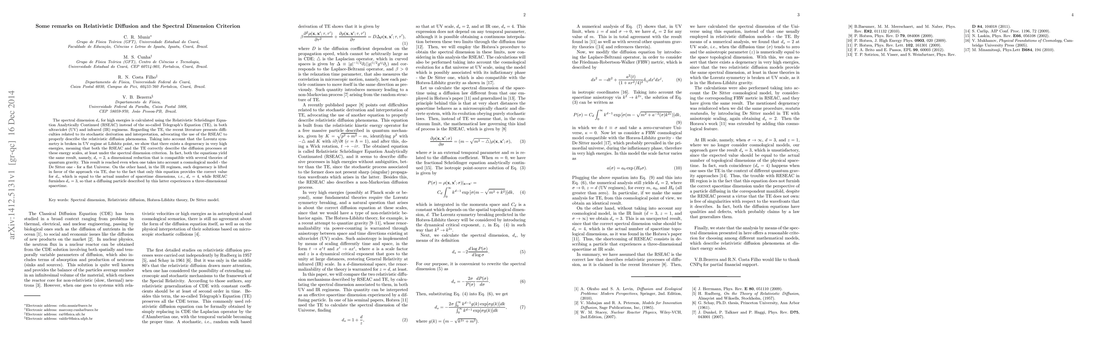 The spectral dimension $d_s$ for high energies is calculated using the Relativistic Schr\"{o}dinger Equation Analytically Continued (RSEAC) instead of the so-called Telegraph's Equation (TE), in both ultraviolet (UV) and infrared (IR) regimens. Regarding the TE, the recent literature presents difficulties related to its stochastic derivation and interpretation, advocating the use of the RSEAC to properly describe the relativistic diffusion phenomena. Taking into account that the Lorentz symmetry is broken in UV regime at Lifshitz point, we show that there exists a degeneracy in very high energies, meaning that both the RSEAC and the TE correctly describe the diffusion processes at these energy scales, at least under the spectral dimension criterion. In fact, both the equations yield the same result, namely, $d_s = 2$, a dimensional reduction that is compatible with several theories of quantum gravity. This result is reached even when one takes into account a cosmological model - the De Sitter one - for a flat Universe. On the other hand, in the IR regimen, such degeneracy is lifted in favor of the approach via TE, due to the fact that only this equation provides the correct value for $d_s$, which is equal to the actual number of spacetime dimensions, i. e., $d_s = 4$, while RSEAC furnishes $d_s=3$, so that a diffusing particle described by this latter experiences a three-dimensional spacetime.